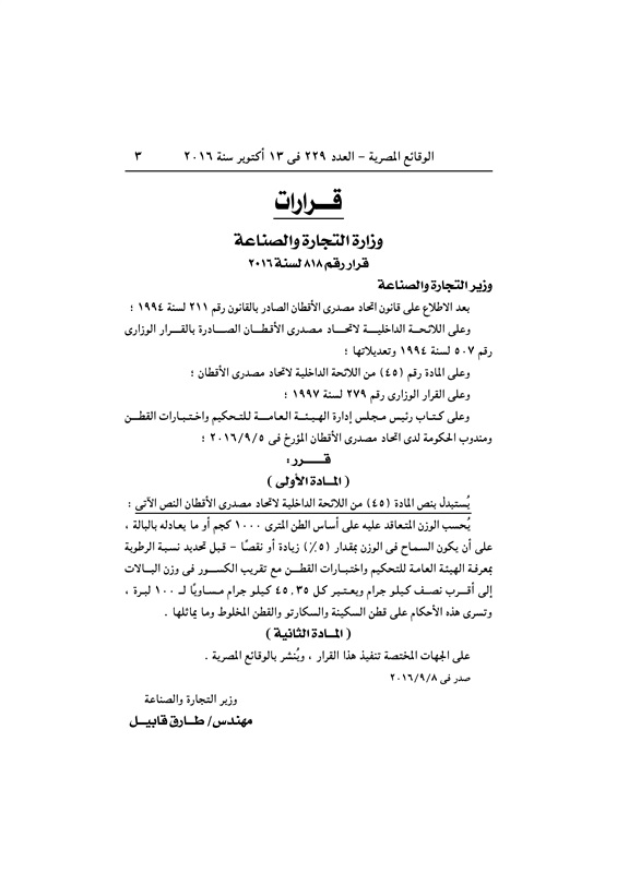 أسواق "التجارة" تعدل اللائحة الداخلية لاتحاد مصدري الأقطان الخميس 13 أكتوبر 2016 - 02:14 م 10/13/2016 2:14:00 PM طارق قابيل - وزير التجارة والصناعة المصدر - خاص طباعة شارك نشرت الوقائع الرسمية في العدد رقم 229 الصادر في 13 أكتوبر 2016، قرار وزارة التجارة والصناعة رقم 818 لسنة 2016، بشأن تعديل اللائحة الداخلية لاتحاد مصدري الأقطان.لقراءة القرار: طباعة شارك طارق قابيل الوقائع المصرية القطن التجارة والصناعة الاقطان تابع المصدر علي جوجل نيوز تطبيق نبض
