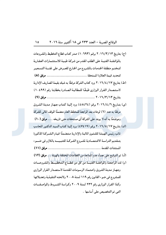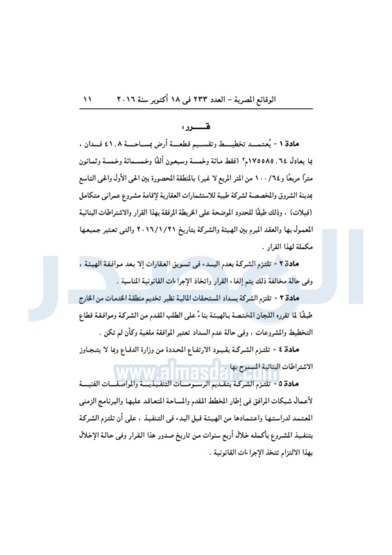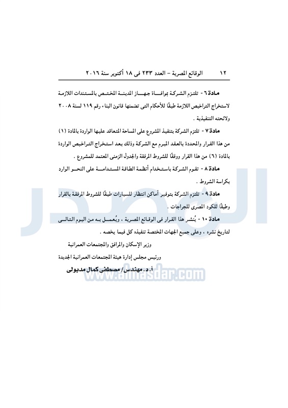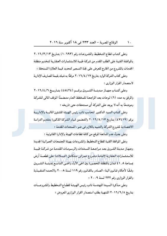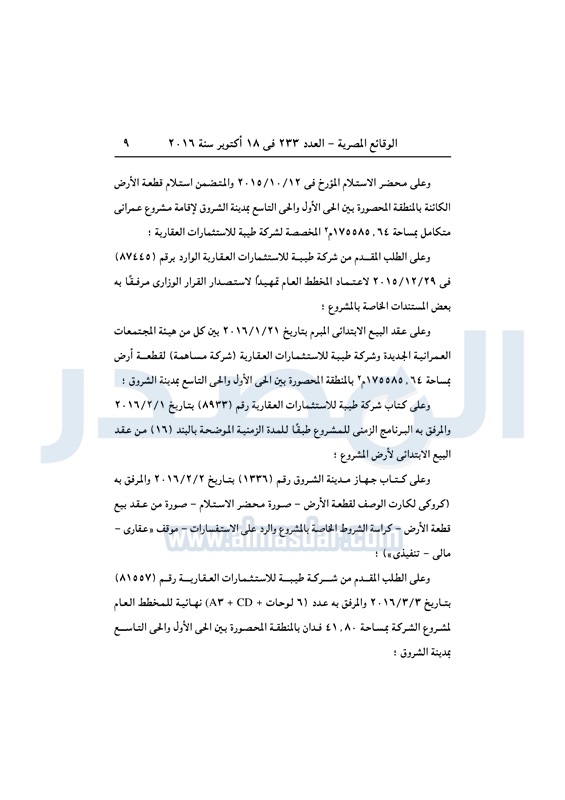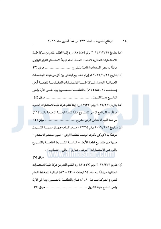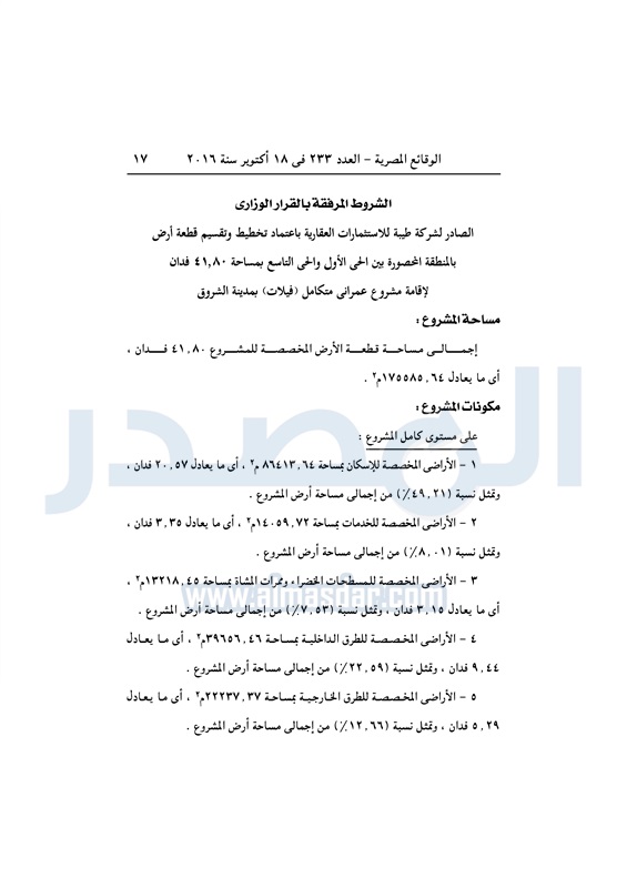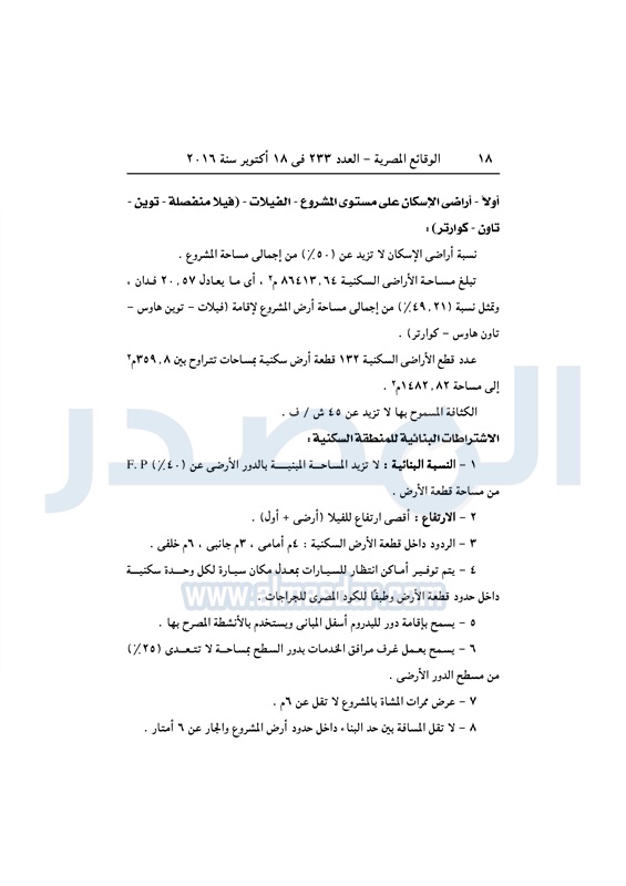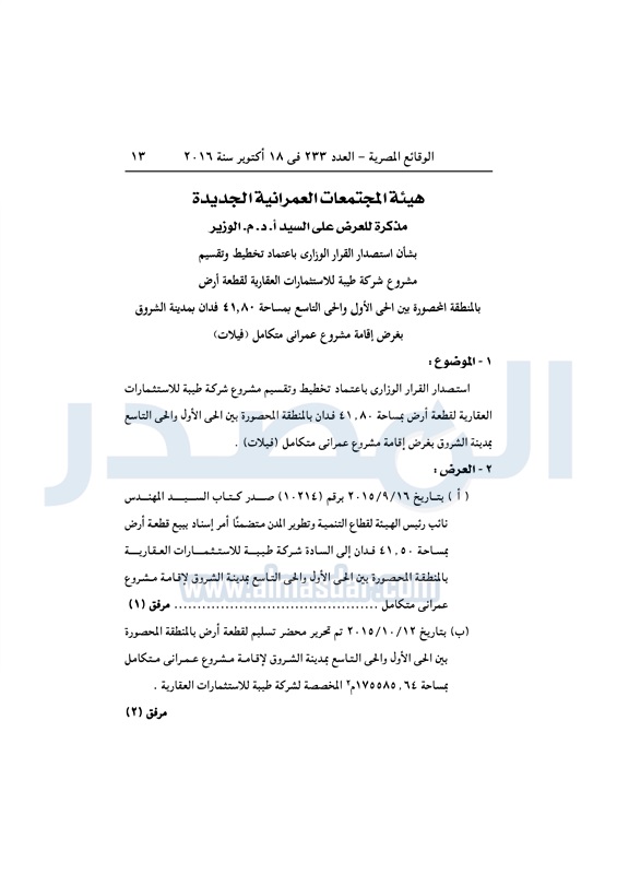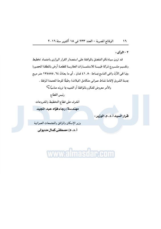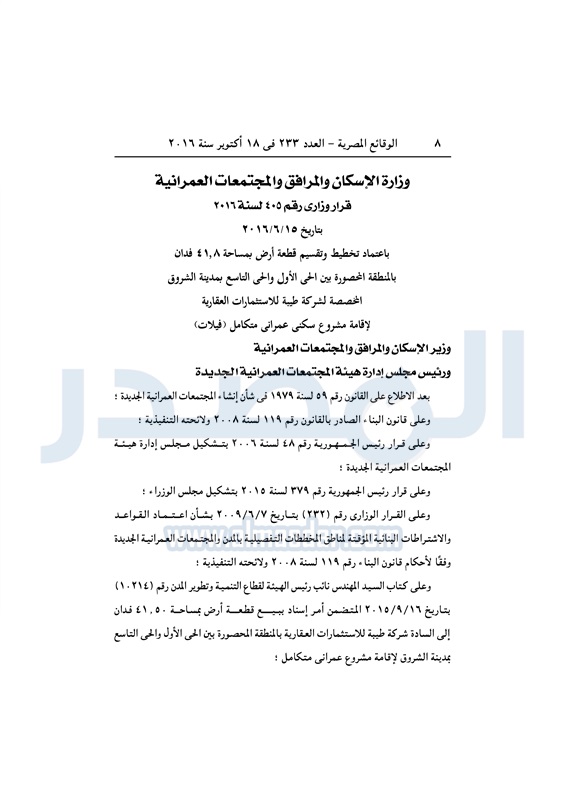 عقارات اعتماد تخطيط قطعة أرض بالشروق لإقامة مشروع سكني متكامل الثلاثاء 18 أكتوبر 2016 - 01:59 م 10/18/2016 1:59:00 PM مصطفى مدبولي - وزير الإسكان المصدر - خاص طباعة شارك نشرت الوقائع المصرية في العدد رقم 233 الصادر في 18 أكتوبر 2016، قرار وزارة الاسكان رقم 405 لسنة 2016، بشأن اعتماد تخطيط قطعة أرض بمدينة الشروق لإقامة مشروع سكني متكامل.لقراءة القرار: طباعة شارك مشروع سكني الوقائع المصرية القاهره الجديده الشروق الإسكان تابع المصدر علي جوجل نيوز تطبيق نبض