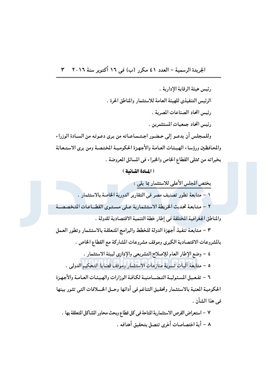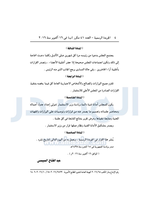 استثمار السيسي يقرر إنشاء المجلس الأعلى للاستثمار برئاسته الثلاثاء 18 أكتوبر 2016 - 06:58 م 10/18/2016 6:58:45 PM عبد الفتاح السيسي رئيس الجمهورية المصدر - خاص طباعة شارك نشرت الجريدة الرسيمة في العدد رقم 41 مكرر "ب" الصادر في 16 أكتوبر 2016، قرار رئيس الجمهورية رقم 478 لسنة 2016، بشأن تشكيل المجلس الأعلى للاستثمار برئاسته.لقراءة القرار: طباعة شارك قرار جمهورى المجلس الأعلى للاستثمار السيسى الجريدة الرسمية الإستثمار تابع المصدر علي جوجل نيوز تطبيق نبض