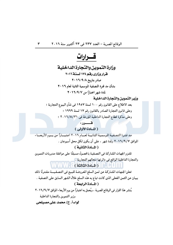أسواق الوقائع المصرية تنشر قرار وزير التموين بمد فترة التصفية الموسمية الأحد 23 أكتوبر 2016 - 11:20 ص 10/23/2016 11:20:00 AM محمد على مصيلحي - وزير التموين المصدر - خاص طباعة شارك نشرت الوقائع المصرية في العدد 237 الصادر في 23 أكتوبر 2016، قرار وزارة التموين رقم 174 لسنة 2016، بشأن مد فترة التصفية الموسمية الثانية لعام 2016، لمدة شهر.لقراءة القرار: طباعة شارك وزير التموين محمد مصيلحى الجريدة الرسمية التصفية الموسمية تابع المصدر علي جوجل نيوز تطبيق نبض