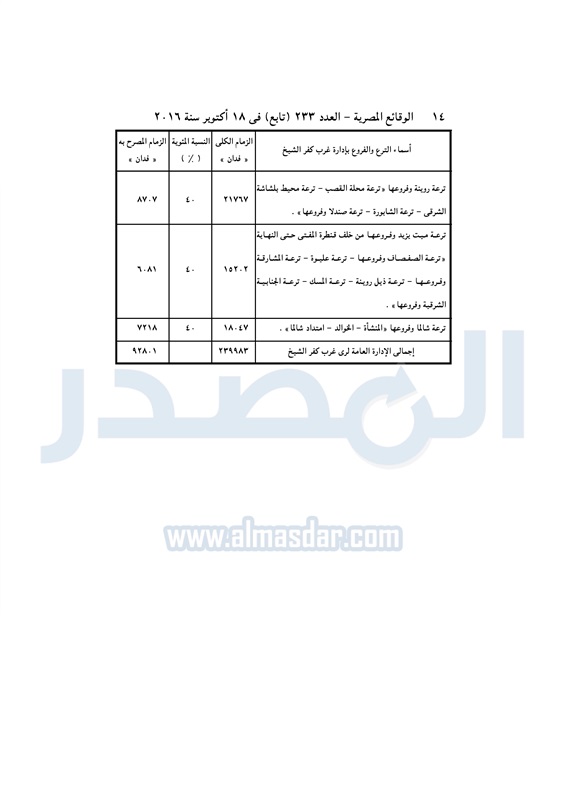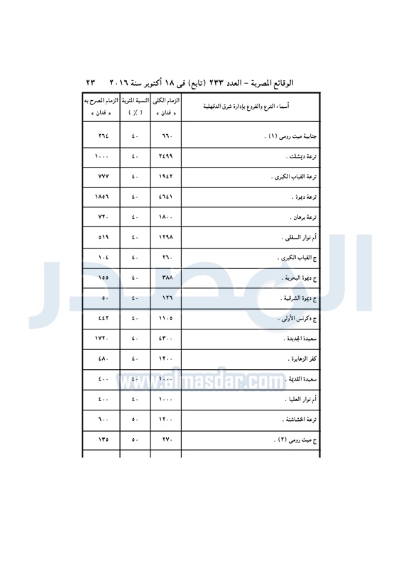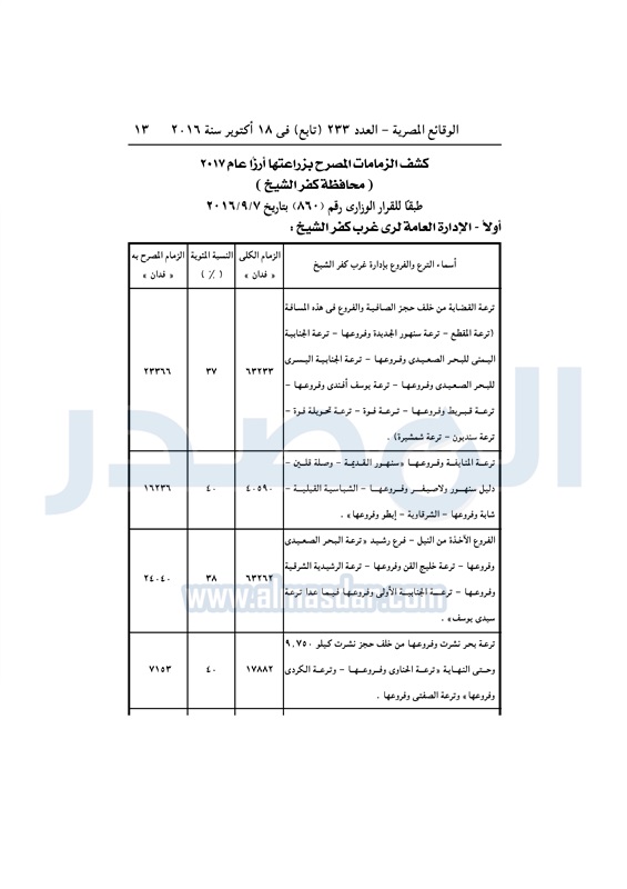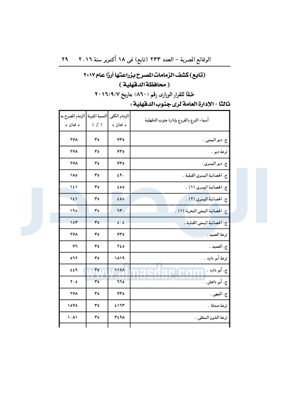 نشرت الوقائع المصرية في العدد رقم 233 "تابع" الصادر في 18 أكتوبر 2016، قرار وزارة الموارد المائية والري رقم 860 لسنة 2016، بشأن تحديد المساحات المخصصة لزراعة الأرز بالمحافظات.