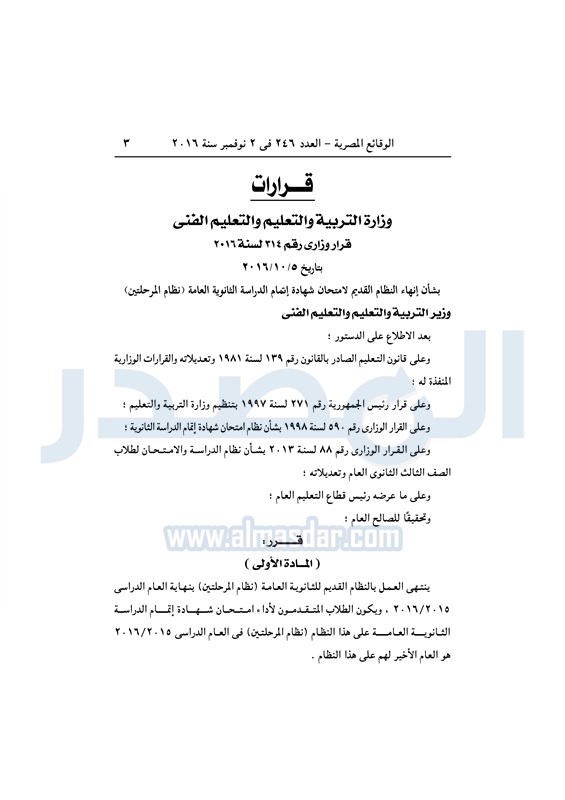 نشرت الوقائع المصرية في العدد رقم 246 الصادر في 2 نوفمبر 2016، قرار وزارة التربية والتعليم رقم 314 لسنة 2016، بشأن إنهاء النظام القديم لامتحان الثانوية العامة "نظام المرحلتين".