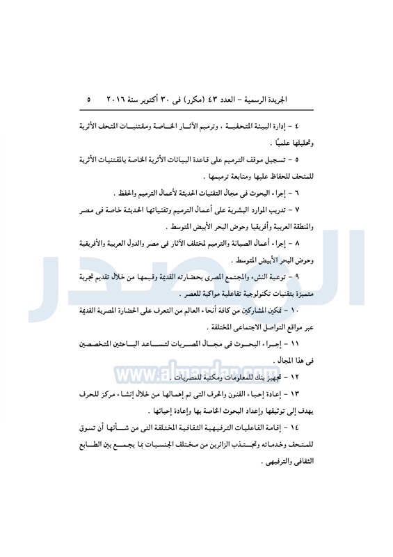 نشرت الجريدة الرسمية في العدد رقم 34 "مكرر" الصادر في 30 اكتوبر 2016، قرارات رئيس مجلس الوزارء رقم 2795، و2796 لسنة 2016، بشأن إنشاء المتحف المصري الكبير، وإنشاء وتنظيم المتحف القومي للحضارة المصرية.