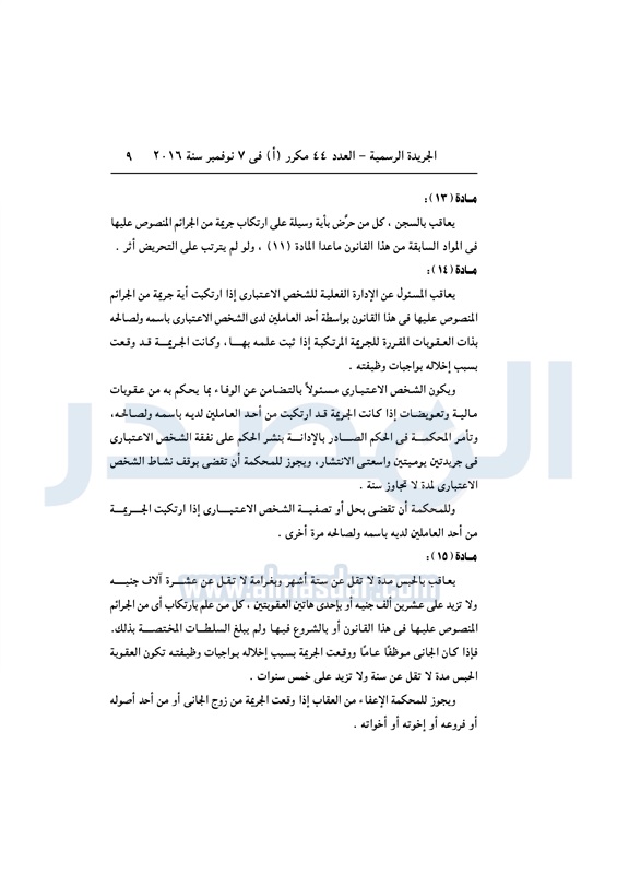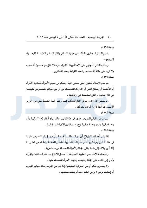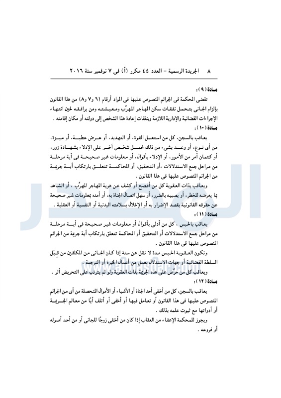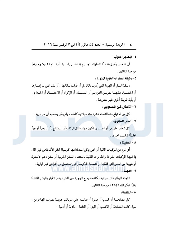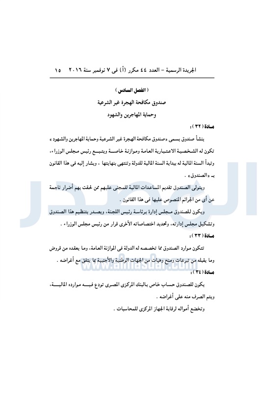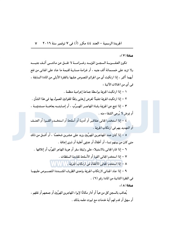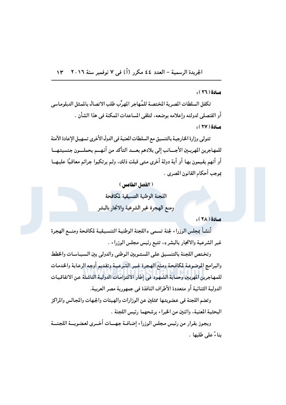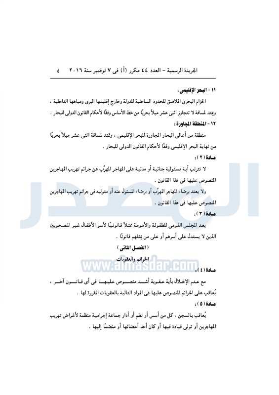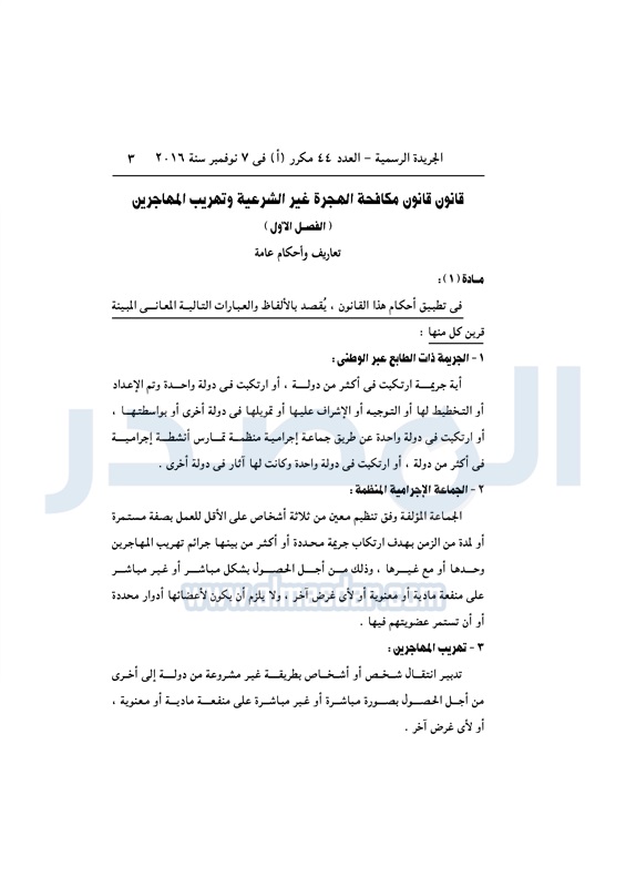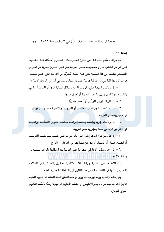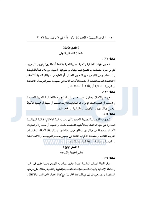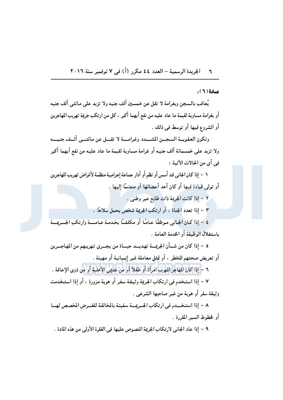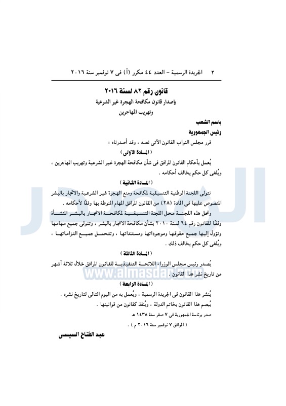 أخبار مصر السيسي يصدق على قانون مكافحة الهجرة غير الشرعية الأربعاء 09 نوفمبر 2016 - 11:01 ص 11/9/2016 11:01:00 AM عبد الفتاح السيسي رئيس الجمهورية المصدر - خاص طباعة شارك نشرت الجريدة الرسمية في العدد رقم 44 "مكرر" أ الصادر في 7 نوفمبر 2016، قرار رئيس الجمهورية رقم 82 لسنة 2016، بشأن إصدار قانون مكافحة الهجرة غير الشرعية وتهريب المهاجرين.لقراءة القرار: طباعة شارك الهجرة غير الشرعية الهجرة المهاجرين السيسى الجريدة الرسمية تابع المصدر علي جوجل نيوز تطبيق نبض