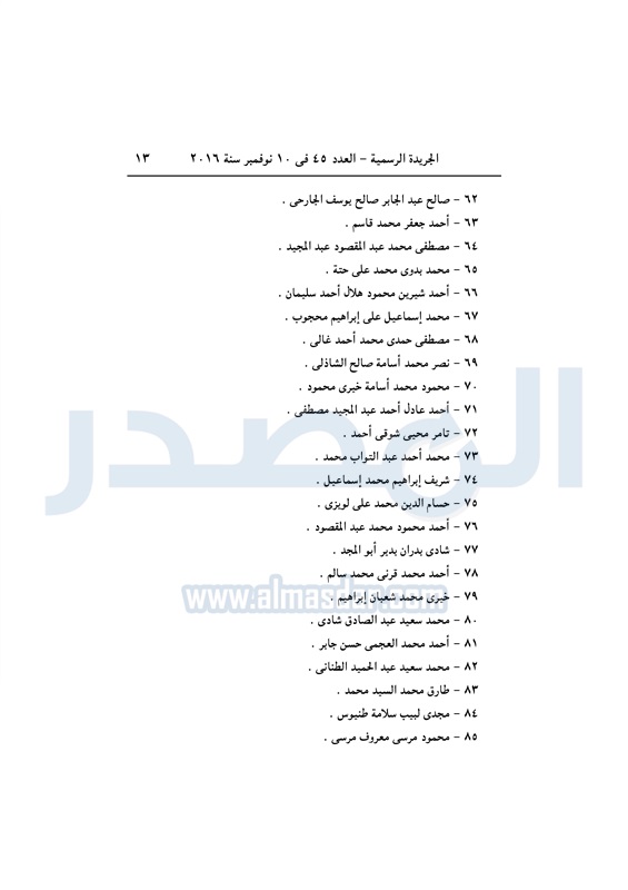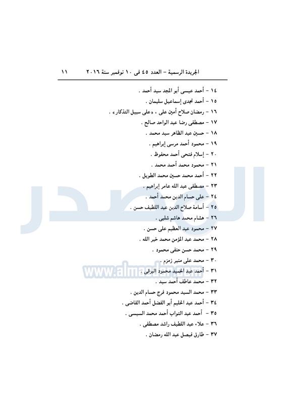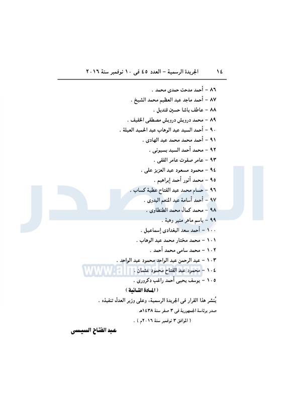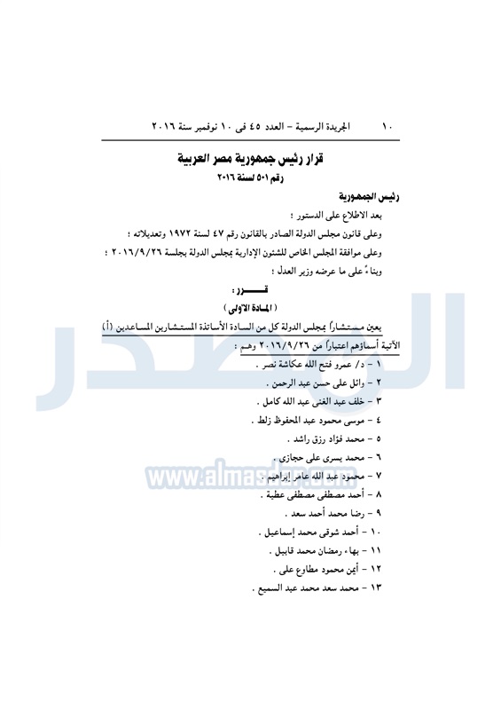 أخبار مصر بالأسماء.. السيسي يعين 105 مستشارين بمجلس الدولة الخميس 10 نوفمبر 2016 - 10:23 ص 11/10/2016 10:23:00 AM عبد الفتاح السيسي رئيس الجمهورية المصدر - خاص طباعة شارك نشرت الجريدة الرسمية في العدد رقم 45 الصادر في 10 نوفمبر 2016، قرار رئيس الجمهورية رقم 501 لسنة 2016، بشأن تعيين 105 مستشارين بمجلس الدولة.لقراءة القرار: طباعة شارك مستشارين مجلس الدولة قرار جمهورى تعيينات السيسى الجريدة الرسمية تابع المصدر علي جوجل نيوز تطبيق نبض