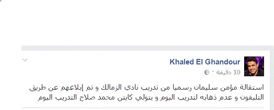 وأكد الغندور عبر حسابه بـ"فيسبوك"، أن مؤمن أبلغ إدارة الزمالك استقالته عن طريق التليفون وعدم ذهابه لتدريب اليوم.