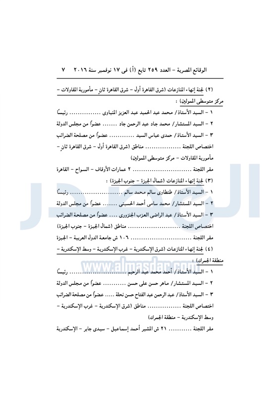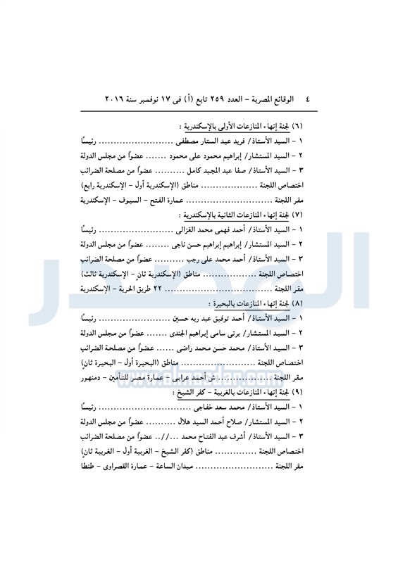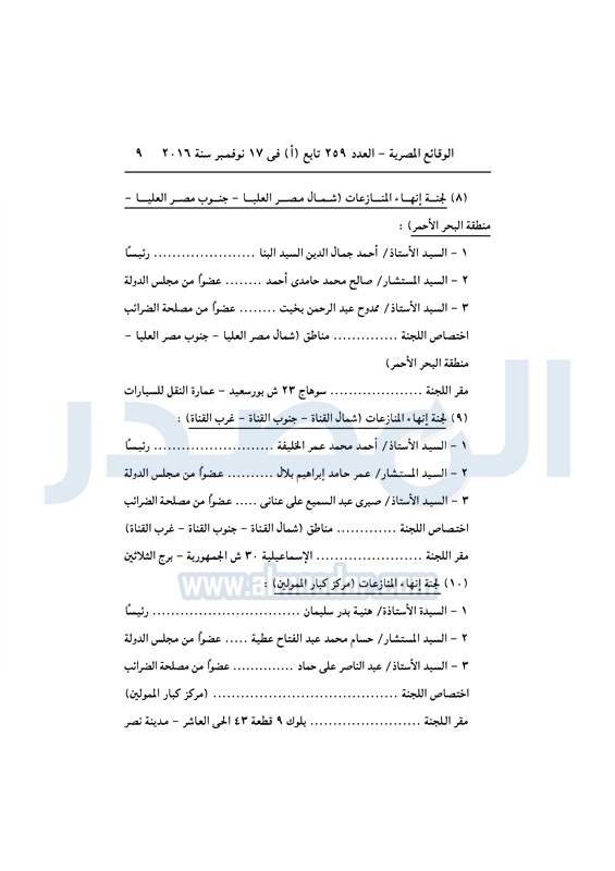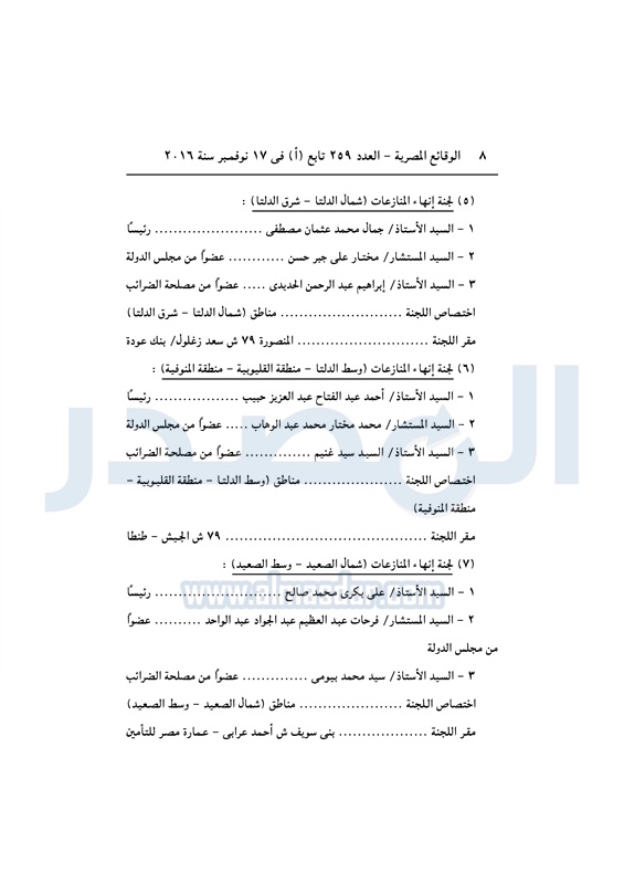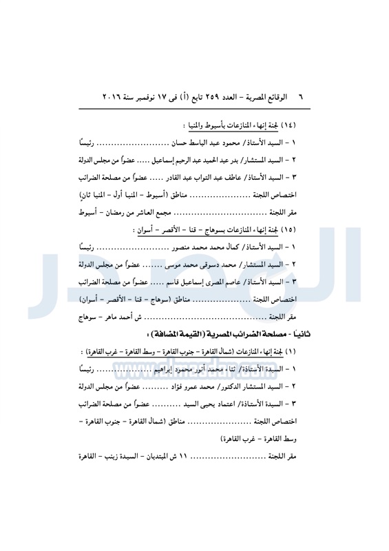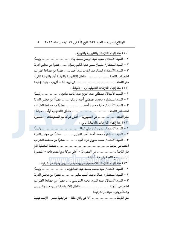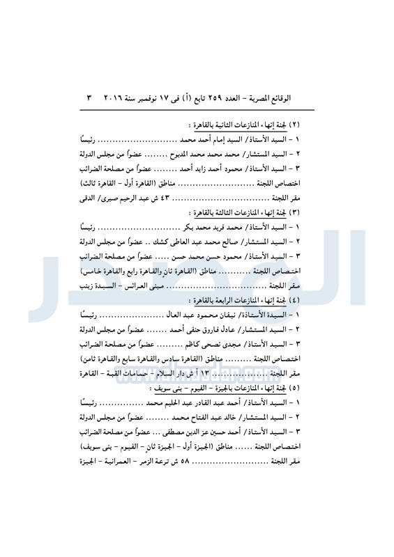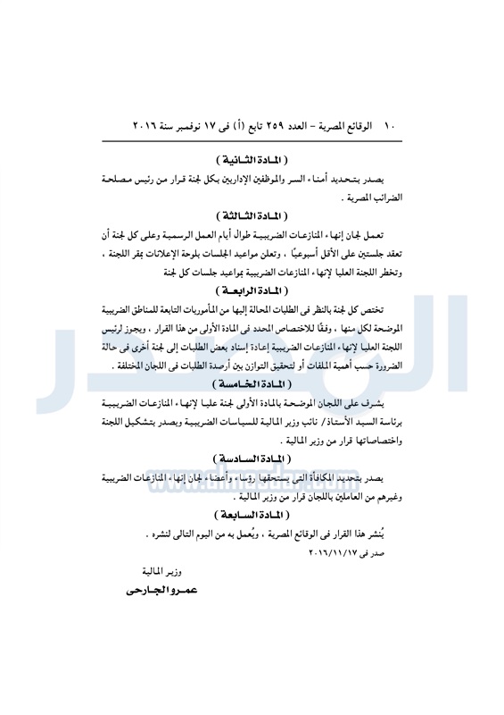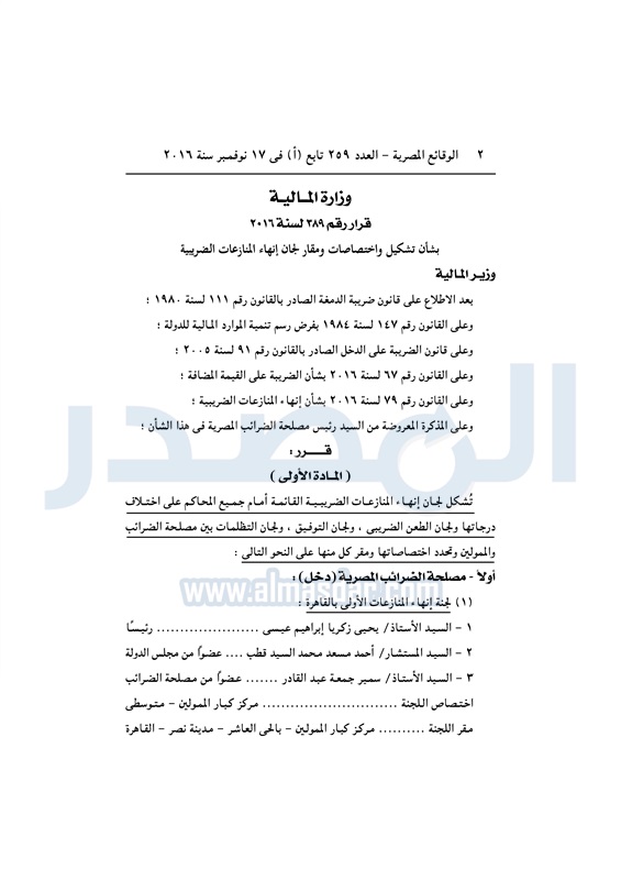 نشرت الوقائع المصرية في العدد رقم 264 الصادر في 23 نوفمبر 2016، قرار وزارة المالية رقم 389 لسنة 2016، بشأن تشكيل واختصاصات ومقار لجان إنهاء اامنازعات الضريبية.