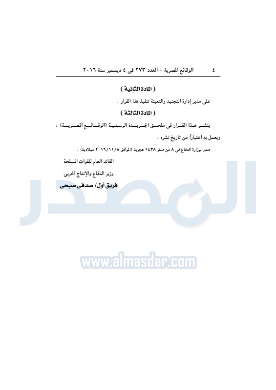 نشرت الوقائع المصرية في العدد رقم 273 الصادر في 4 ديسمبر 2016، قررات وزارة الدفاع بشأن تأجيل تجنيد الطلبة الملتحقين للدراسة بالمعهد الفني للتمريض بكلية التمريض بجامعة الزقازيق، وتأجيل تجنيد الطلبة الملتحقين للدراسة بمدرسة الخط العربي بالمنيا.
