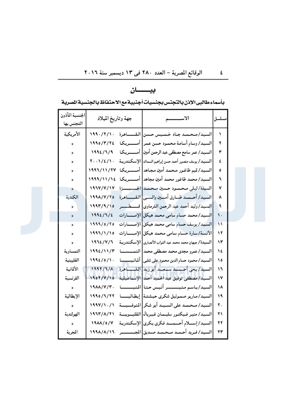 أخبار مصر الداخلية تأذن لـ 23 شخصًا بالتجنس بالجنسية الأجنبية الثلاثاء 13 ديسمبر 2016 - 10:44 ص 12/13/2016 10:44:00 AM مجدي عبد الغفار - وزير الداخلية المصدر - خاص طباعة شارك نشرت الوقائع المصرية في العدد رقم 280 الصادر في 13ديسمبر 2016، قرار وزارة الداخلية رقم 4403 لسنة 2016، بشأن الإذن لـ 23 شخصا بالتجنس بالجنسية الأجنبية.لقراءة القرار: طباعة شارك ويزر الداخلية الوقائع المصرية الداخلية الجنسية الاجنبية تابع المصدر علي جوجل نيوز تطبيق نبض