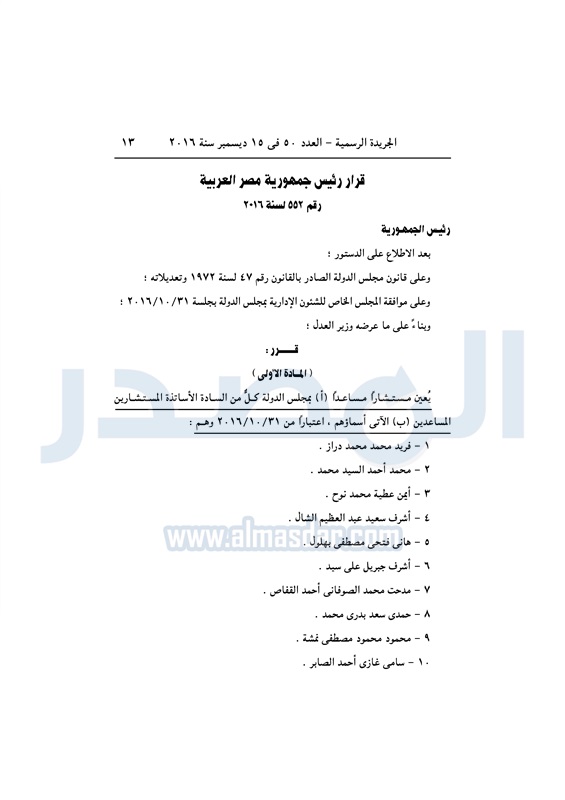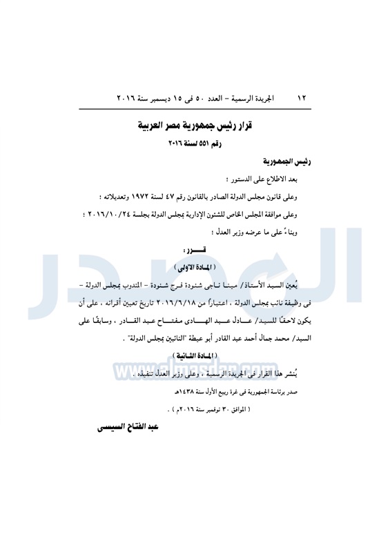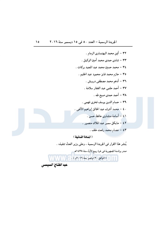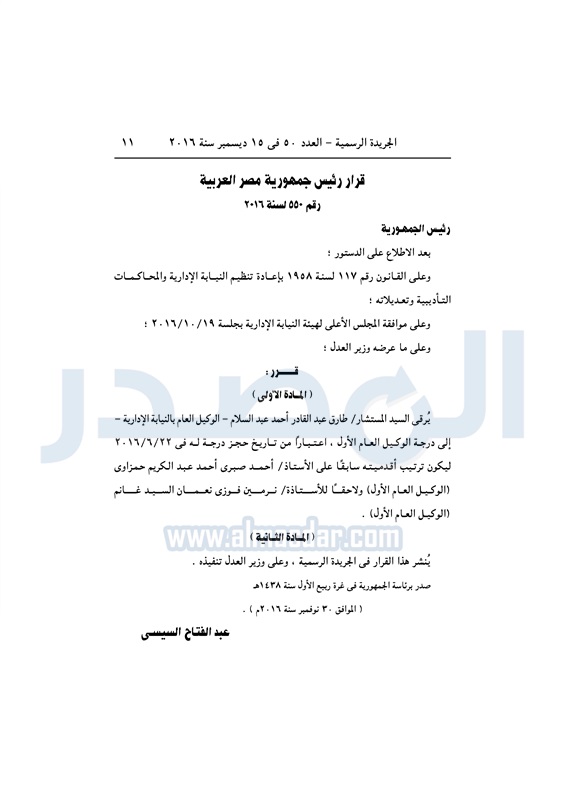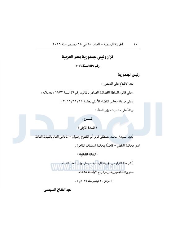 أخبار مصر بالأسماء.. السيسي يجري حركة تعيينات وترقيات بالهيئات القضائية الخميس 15 ديسمبر 2016 - 10:17 ص 12/15/2016 10:17:00 AM عبد الفتاح السيسي رئيس الجمهورية المصدر - خاص طباعة شارك نشرت الجريدة الرسمية في العدد رقم 50 الصادر في 15 ديسمبر 2016، قرارات رئيس الجمهورية بشأن إجراء حركة تعيينات وترقيات بالهيئة القضائية.لقراءة القرارات: طباعة شارك محكمة النقض مجلس الدولة قرار جمهورى تعيينات النيابة الادارية القضاء السيسى تابع المصدر علي جوجل نيوز تطبيق نبض