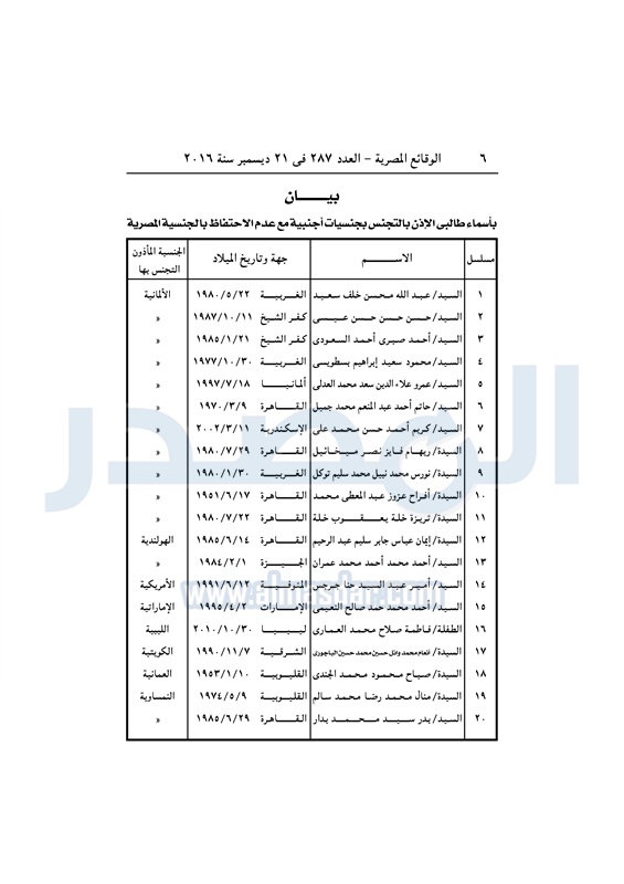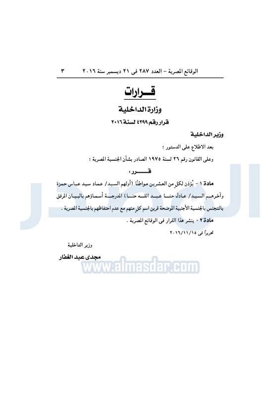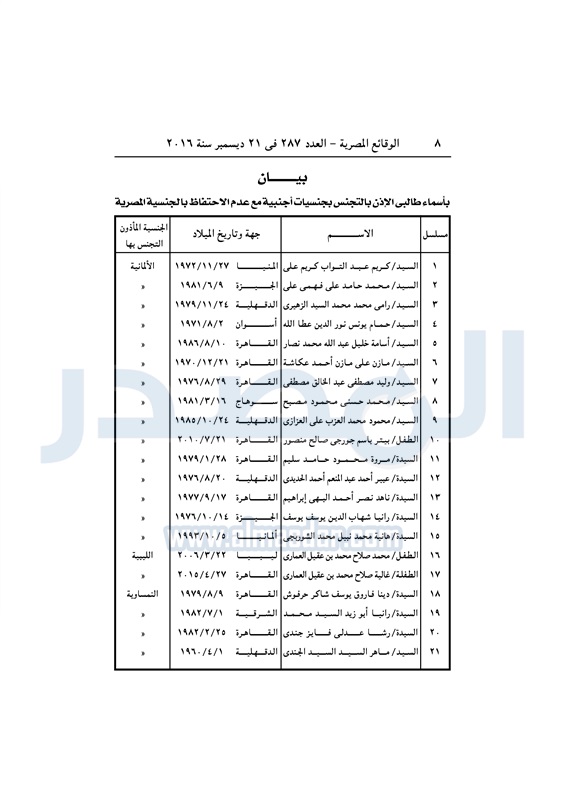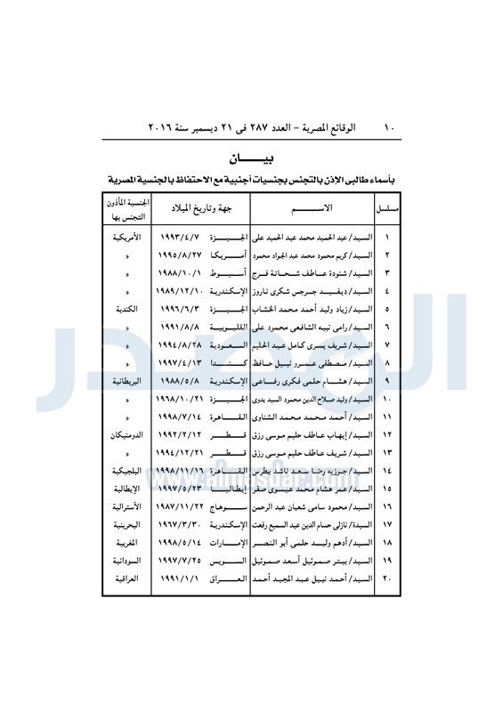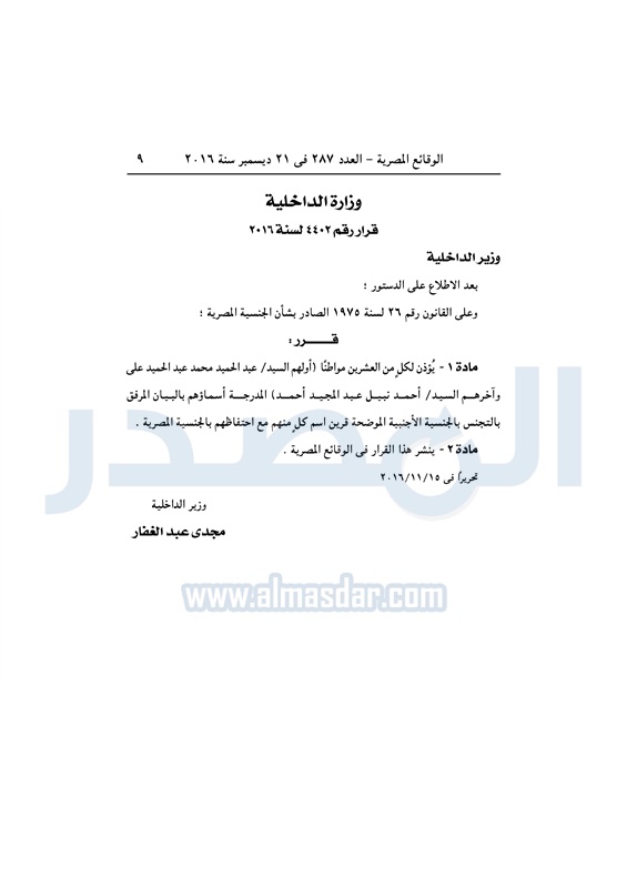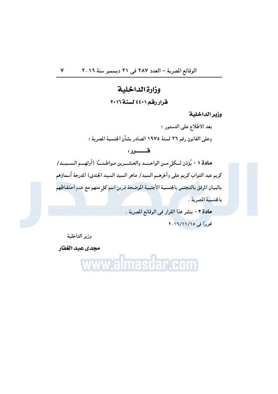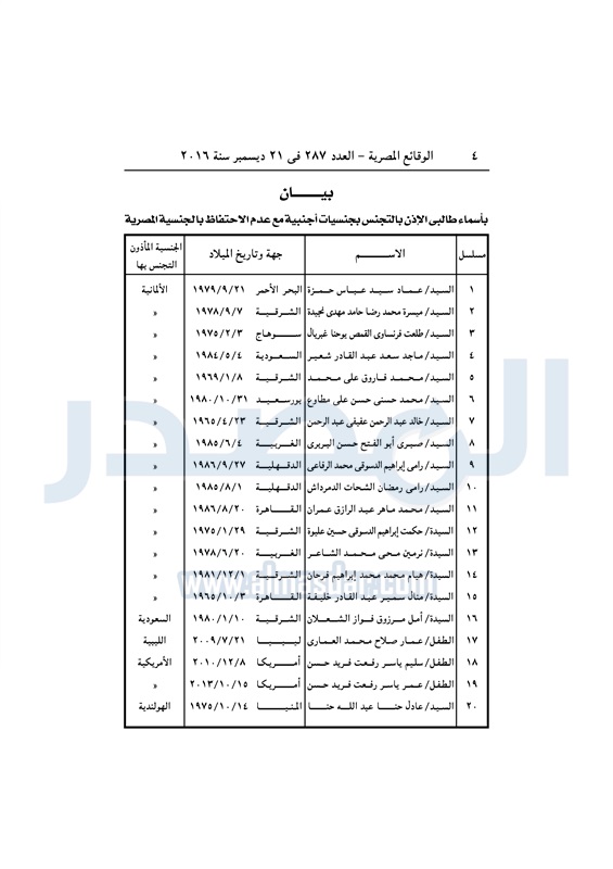 أخبار مصر بالأسماء.. الداخلية تأذن لـ81 شخصًا بالتجنس بالجنسيات الأجنبية الأربعاء 21 ديسمبر 2016 - 11:00 ص 12/21/2016 11:00:02 AM مجدي عبد الغفار - وزير الداخلية المصدر - خاص طباعة شارك نشرت الوقائع المصرية فى العدد رقم 287 الصادر في 21 ديسمبر 2016، قرارات وزارة الداخلية بشأن الإذن لـ81 شخصًا بالتجنس بجنسيات أجنبية.لقراءة القرارات: طباعة شارك وزير الداخلية الوقائع المصرية الداخلية الجنسية المصرية الجنسية الاجنبية إسقاط الجنسيه تابع المصدر علي جوجل نيوز تطبيق نبض