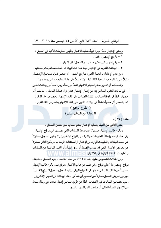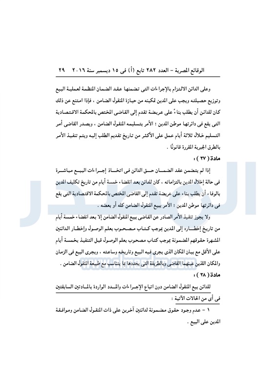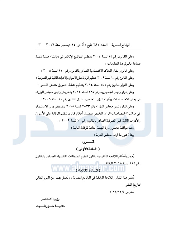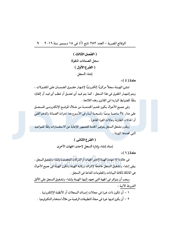 نشرت الوقائع المصرية في العدد رقم 282 تابع "أ" الصادر في 15 ديسمبر 2016، قرار وزارة الاستثمار رقم 108 لسنة 2016، بشأن إصدار اللائحة التنفيذية لقانون تنظيم الضمانات المنقولة.