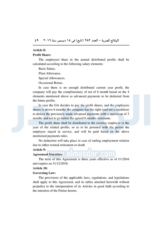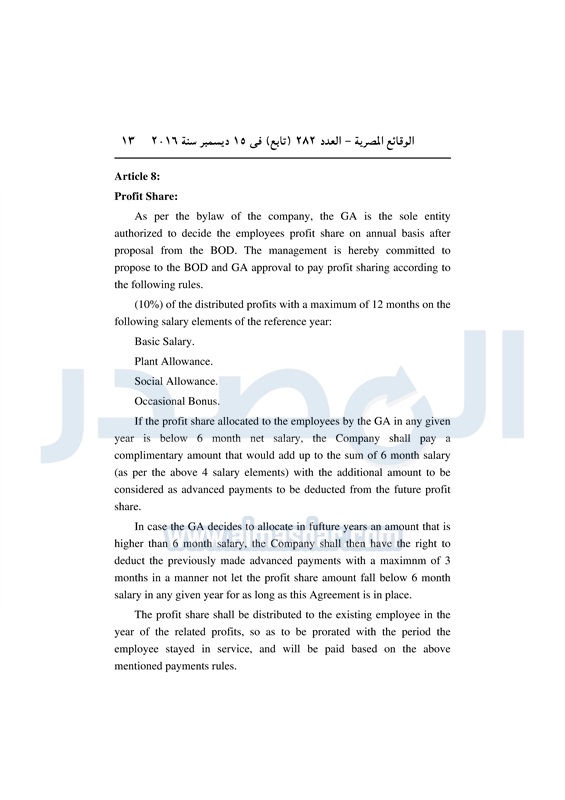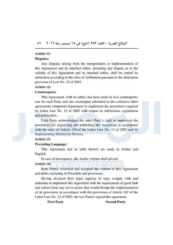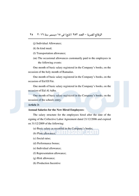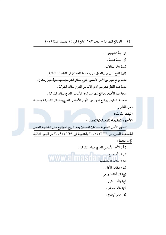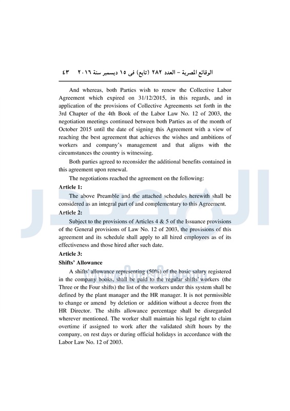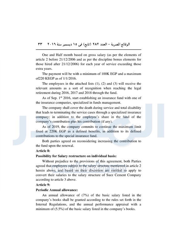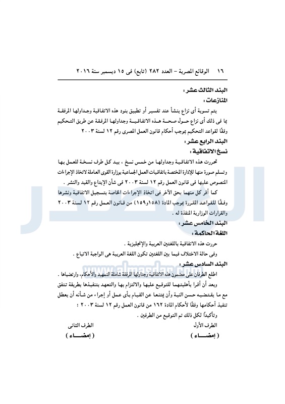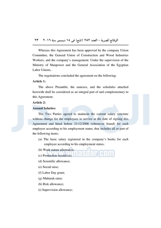 نشرت الوقائع المصرية في العدد رقم 282 تابع الصادر في 15 ديسمبر 2016، اتفاقية العمل الجماعية للعاملين بشركة السويس للأكياس، وأسمنت حلوان، وشركة طرة للأسمنت، تحت إشراف القوى العاملة.