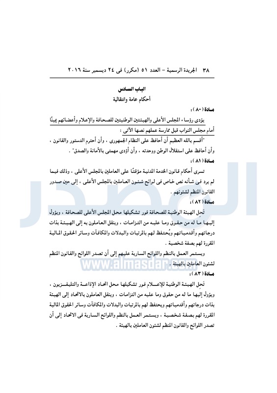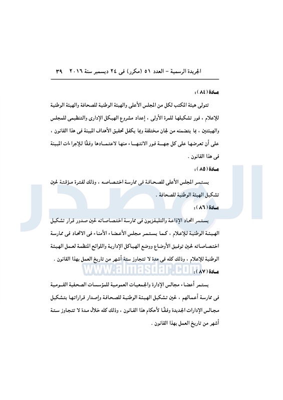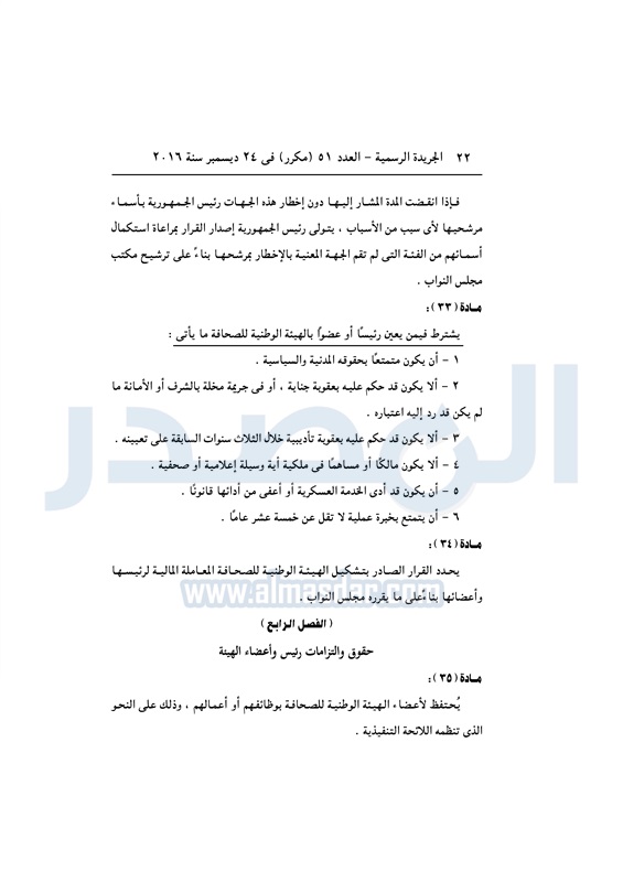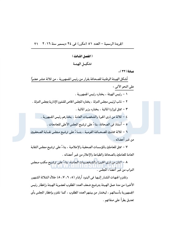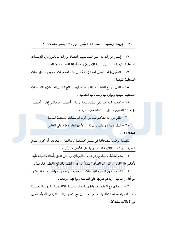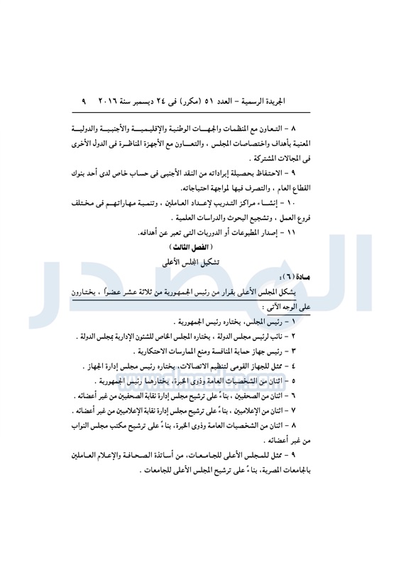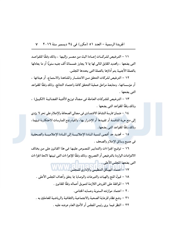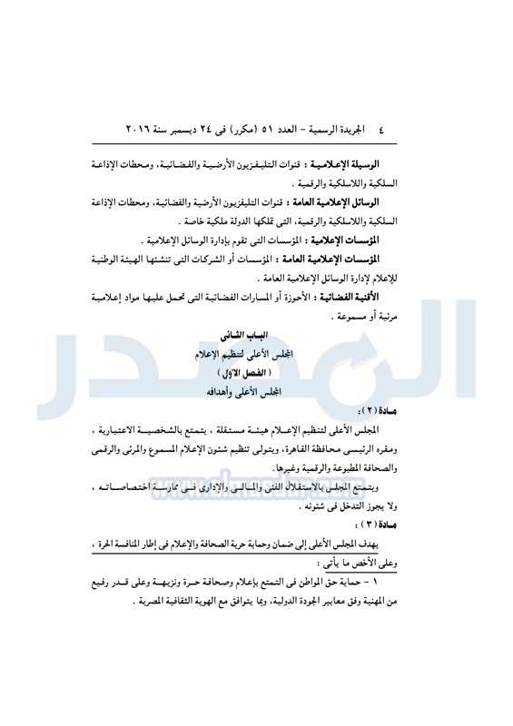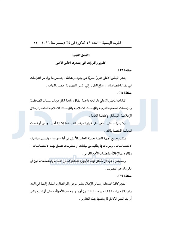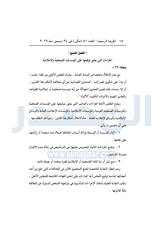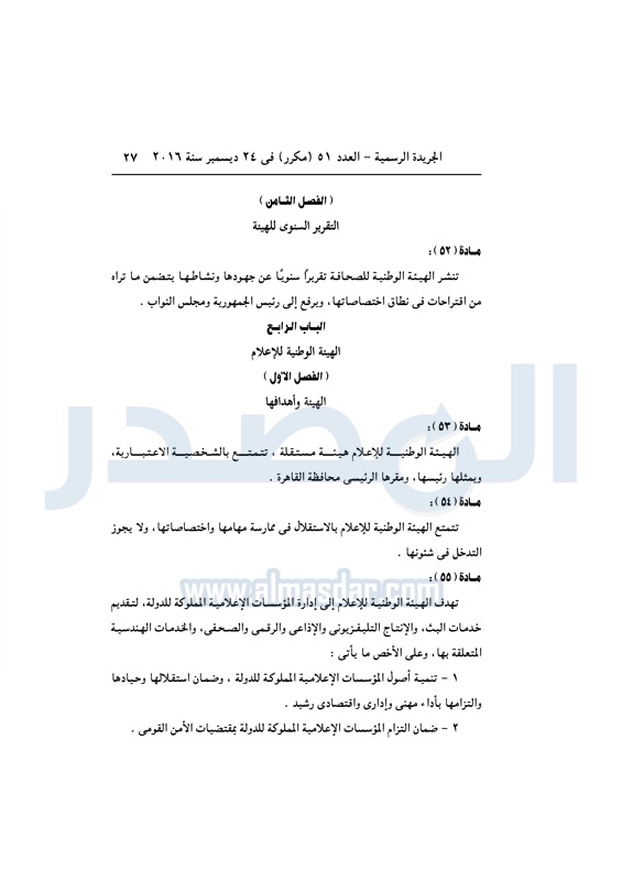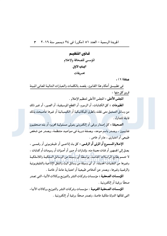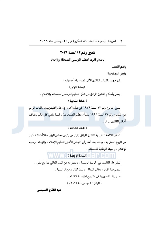 أخبار مصر السيسى يصدر قانون التنظيم المؤسسي للصحافة والإعلام الإثنين 26 ديسمبر 2016 - 07:09 م 12/26/2016 7:09:00 PM الرئيس عبد الفتاح السيسى المصدر - خاص طباعة شارك نشرت الجريدة الرسمية في العدد رقم 51 مكرر الصادر في 24 ديسمبر 2016، قرار رئيس الجمهورية رقم 92 لسنة 2016، بإصدار قانون التنظيم المؤسسي للصحافة والإعلام.لقراءة القرار: طباعة شارك رئيس الجمهورية الصحافة والاعلام السيسى الجريدة الرسمية تابع المصدر علي جوجل نيوز تطبيق نبض