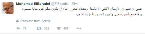 وقال "البرادعي" في تغريدة له عبر صفحته الرسمية على موقع التدوينات الصغيرة "تويتر": "عسى أن نفهم أن الأوطان لا تبنى إلا بالعدل وسيادة القانون، آمل أن يكون حكم اليوم بداية صحوة ووقفة مع النفس لتغيير وتقويم المسار، السيادة للشعب".