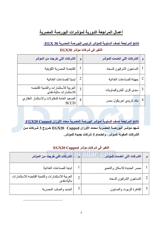 شهدت مؤشرات البورصة المصرية خلال فترة المراجعة الدورية عددا من التغيرات، فقد خرج من المؤشر الرئيس للبورصة المصرية EGX30 أربع شركات في مقابل دخول أربع شركات جديدة.