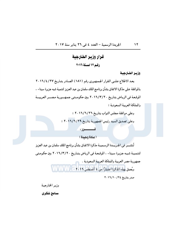 نشرت الجريدة الرسمية في العدد رقم 4 الصادر في 26 يناير 2017، قرار رئيس الجمهورية رقم 181 لسنة 2016، بالموافقة على مذكرة الاتفاق بشأن برنامج الملك سلمان بن عبد العزيز لتنيمة شبه جزيرة سيناء، مع التحفظ بشرط التصديق.
