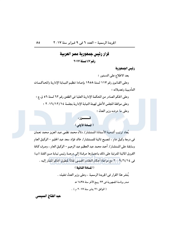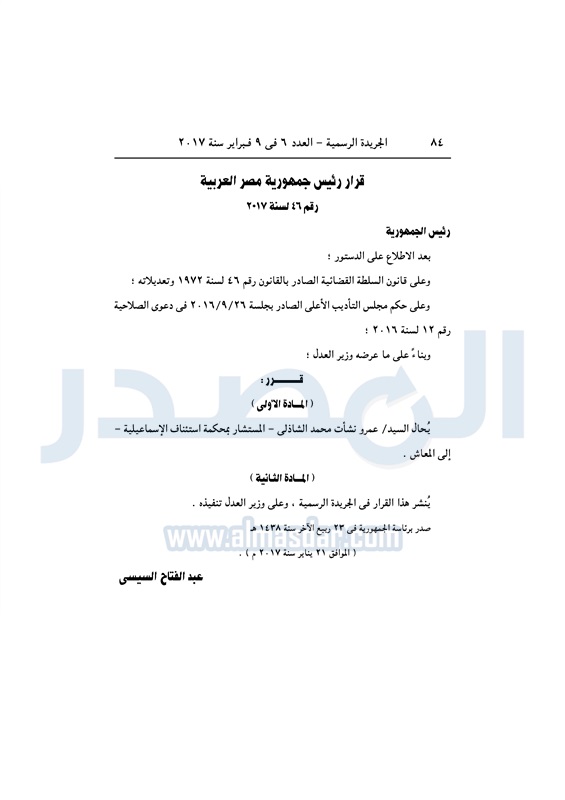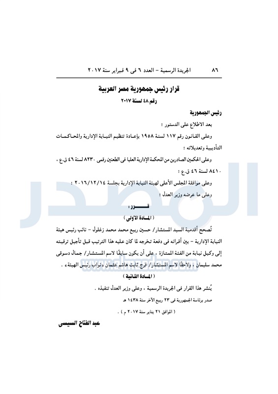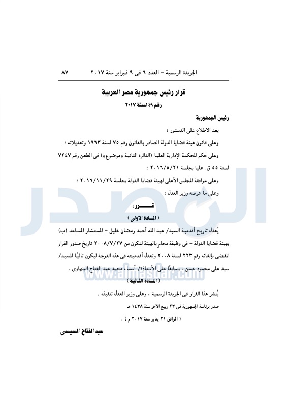 أخبار مصر بالأسماء.. السيسي يجري حركة تغييرات بالهيئات القضائية الخميس 09 فبراير 2017 - 11:40 ص 2/9/2017 11:40:18 AM عبد الفتاح السيسي رئيس الجمهورية المصدر - خاص طباعة شارك نشرت الجريدة الرسمية، فى العدد رقم 6 الصادر في 9 فبراير 2017 قرارات رئيس الجمهورية بشأن إجراء حركة تغيرات بالهيئات القضائية.لقراءة القرارات: طباعة شارك تابع المصدر علي جوجل نيوز تطبيق نبض