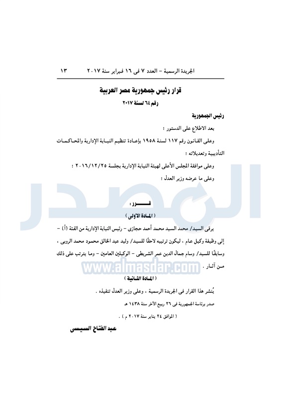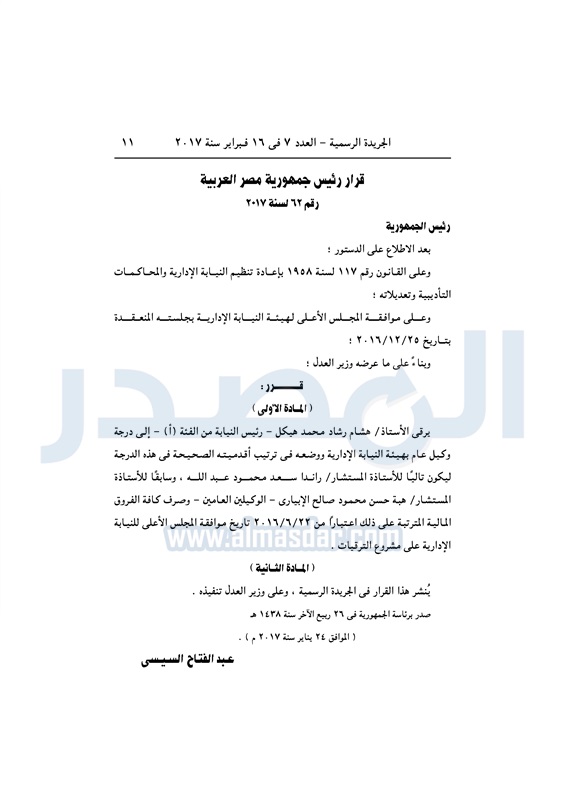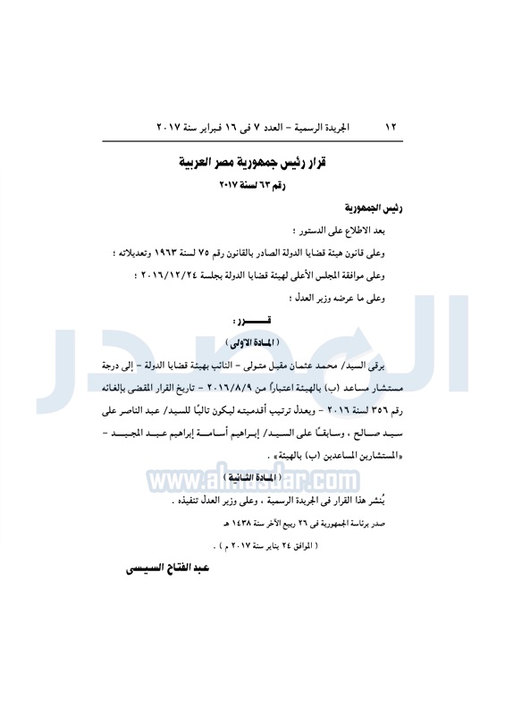 أخبار مصر بالأسماء.. السيسي يجري حركة ترقيات بالهيئات القضايئة الخميس 16 فبراير 2017 - 12:35 م 2/16/2017 12:35:02 PM عبد الفتاح السيسي رئيس الجمهورية المصدر - خاص طباعة شارك نشرت الجريدة الرسمية في العدد رقم 7 الصادر في 16 فبراير 2017، قرارات رئيس الجمهورية بشأن ترقية عدد من العاملين بالهيئات القضائية.لقراءة القرارات: طباعة شارك حركة ترقيات النيابة الادارية القضاء السيسى الجريدة الرسمية أخبار مصر تابع المصدر علي جوجل نيوز تطبيق نبض