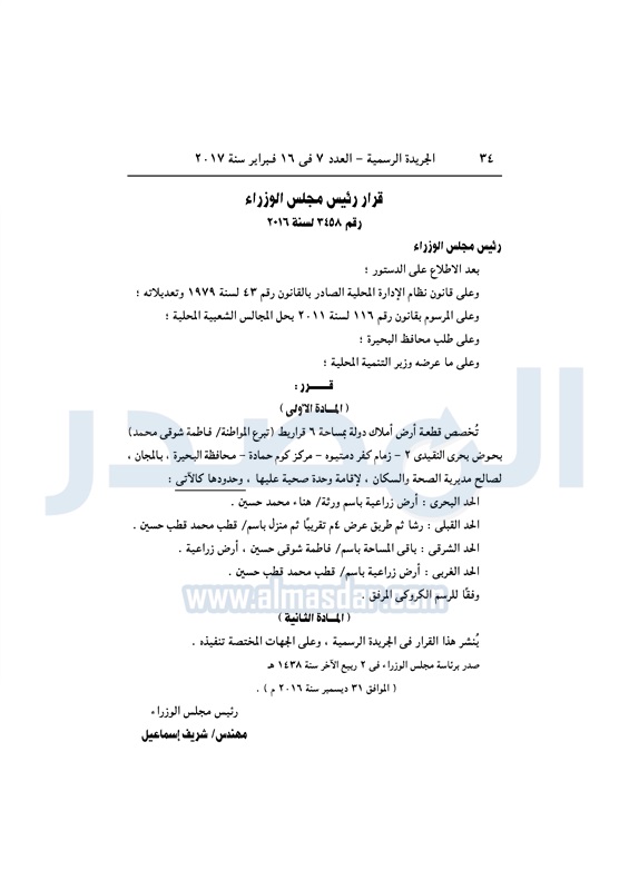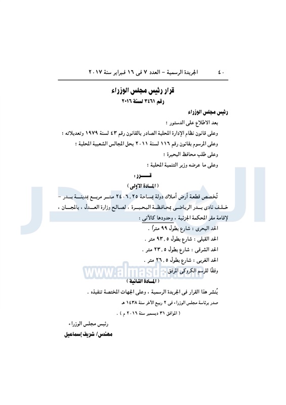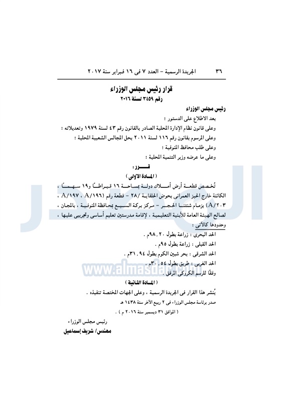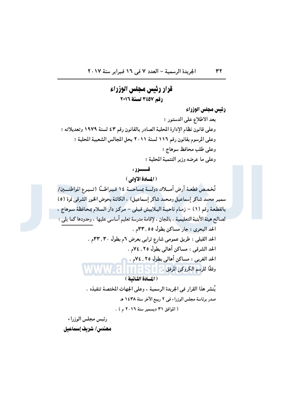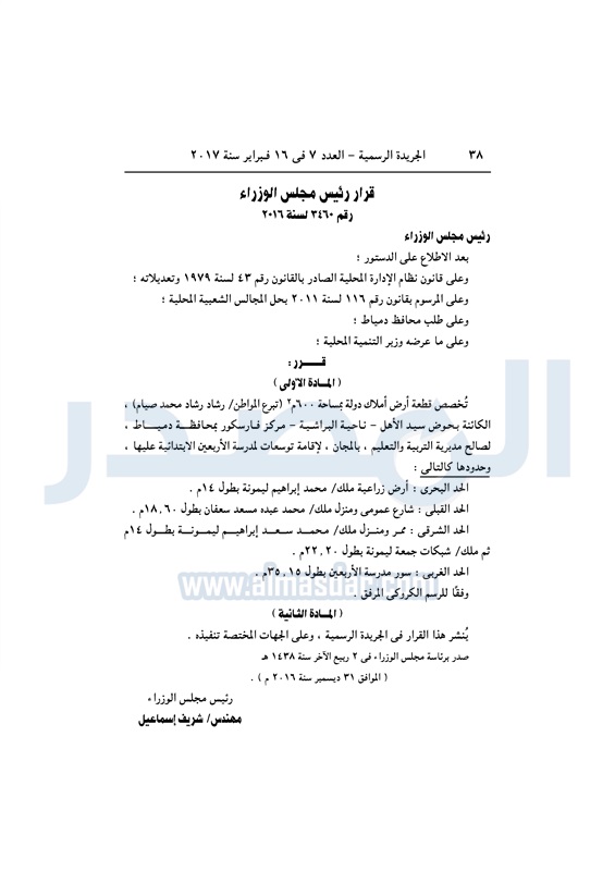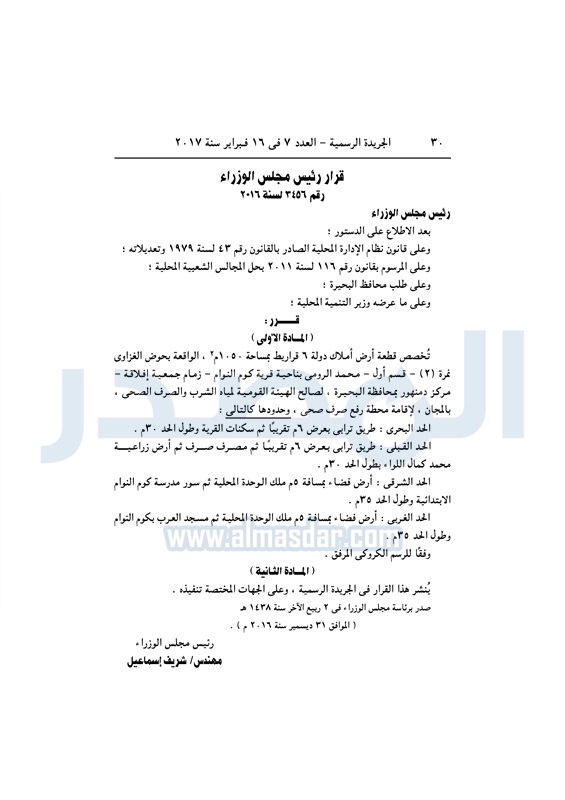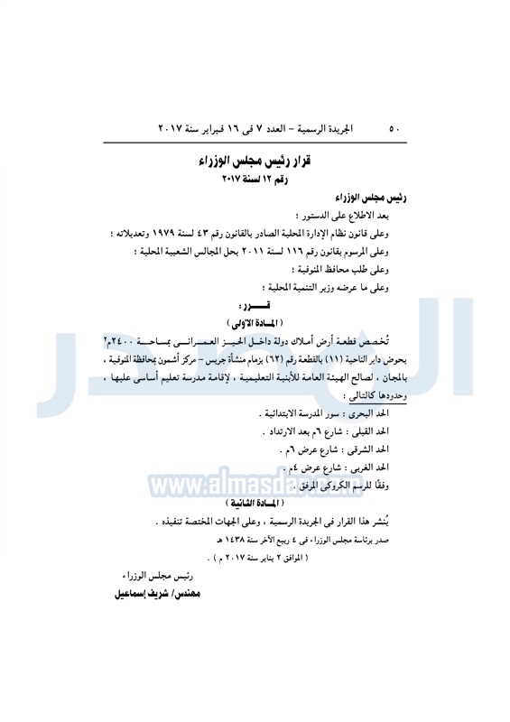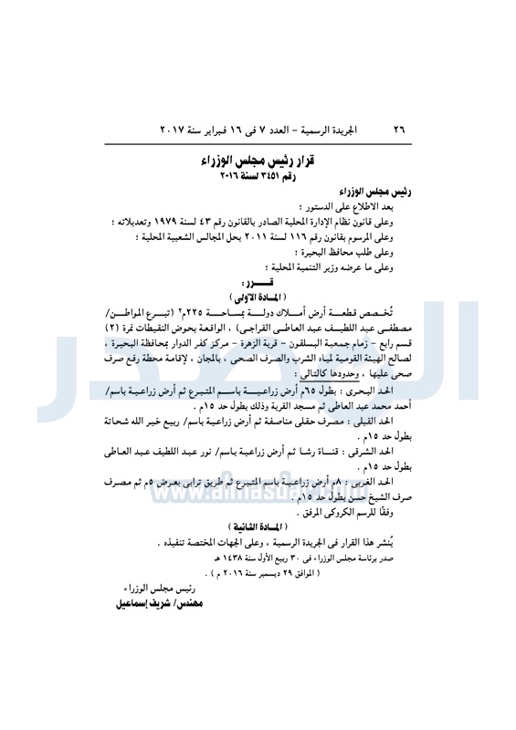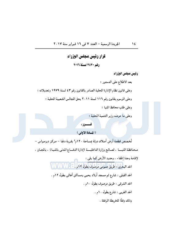 عقارات رئيس الوزراء يخصص قطع أراضي لعدد من الجهات الخميس 16 فبراير 2017 - 01:17 م 2/16/2017 1:17:21 PM شريف إسماعيل رئيس الوزراء المصدر - خاص طباعة شارك نشرت الجريدة الرسمية في العدد رقم 7 الصادر في 16 فبراير 2017، قرارات رئيس مجلس الوزارء، بشأن تخصيص قطع أراضي لعدد من الجهات.لقراءة القرارات: طباعة شارك شريف اسماعيل رئيس الوزراء الجريدة الرسمية أراضى الدولة تابع المصدر علي جوجل نيوز تطبيق نبض