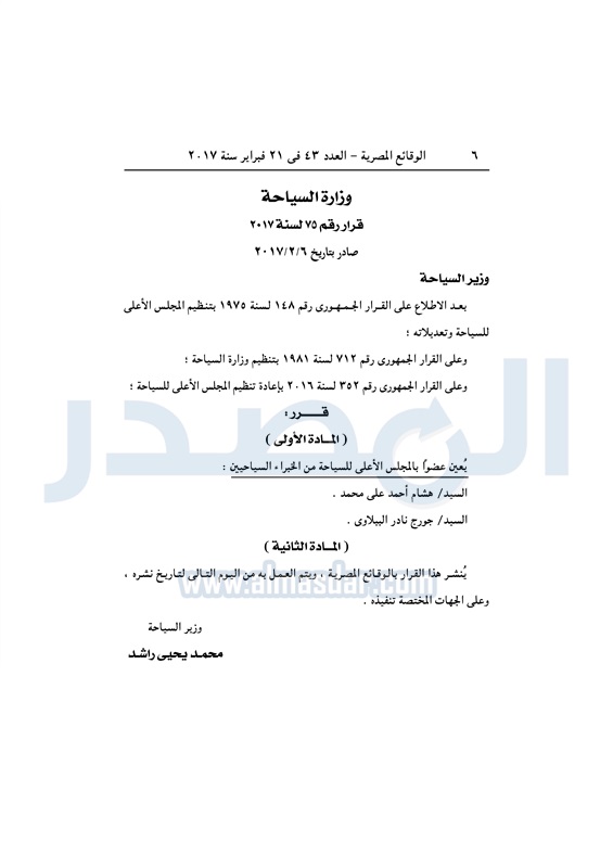 سياحة و طيران تعيين عضوين خبراء بالمجلس الأعلى للسياحة الثلاثاء 21 فبراير 2017 - 11:51 ص 2/21/2017 11:51:15 AM يحيى راشد - وزير السياحة المصدر - خاص طباعة شارك نشرت الوقائع المصرية في العدد رقم 43 الصادر في 21 فبراير 2017، قرار وزارة السياحة رقم 75 لسنة 2017، بشأن تعيين عضوين بالمجلس الأعلى للسياحة.لقراءة القرار: طباعة شارك يحيى راشد وزير السياحه المجلس الأعلى للسياحة السياحة تابع المصدر علي جوجل نيوز تطبيق نبض