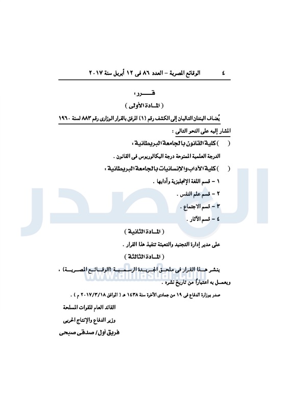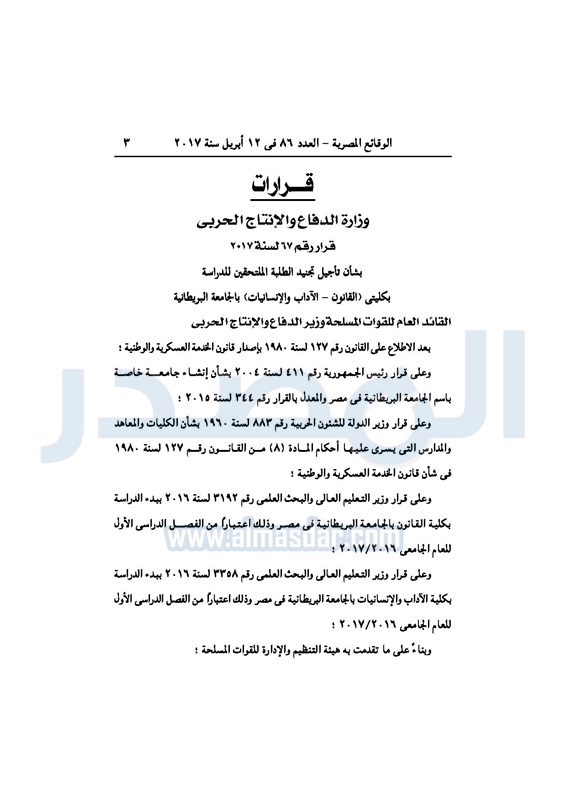 نشرت جريدة الوقائع المصرية، اليوم الأربعاء، بالعدد 86 قرار وزارة الدفاع والإنتاج الحربي بتأجيل تجنيد الطلبة الملتحقين بالدراسة بكليتي "القانون - الآداب والإنسانيات "بالجامعة البريطانية.