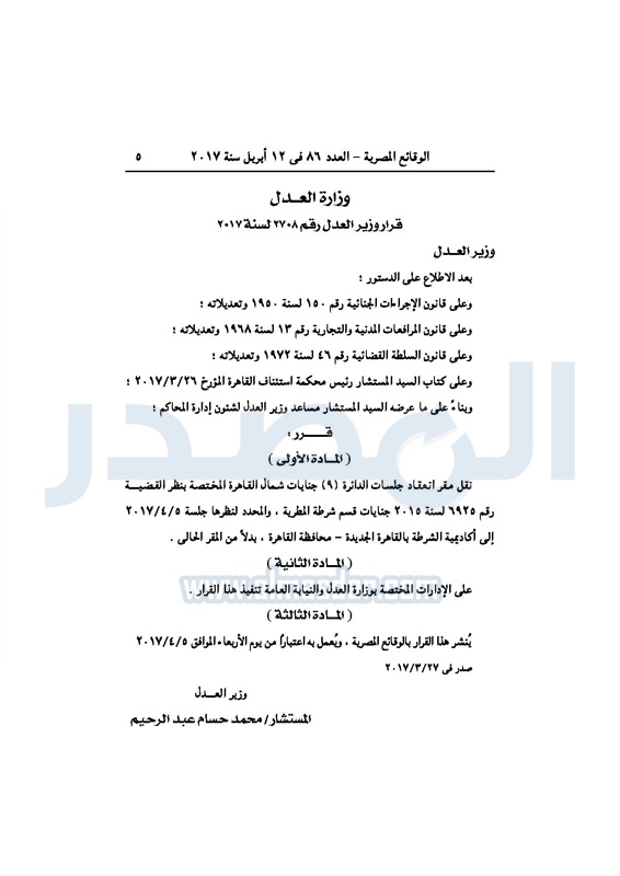 نشرت جريدة الوقائع المصرية اليوم الأربعاء بالعدد 86 قرار وزارة العدل رقم 2708 لسنة 2017، بنقل مقر انعقاد جلسات الدائرة 9 بمحكمة جنايات شمال القاهرة المختصة بنظر القضية رقم 6925 لسنة 2015 جنايات قسم شرطة المطرية إلى أكاديمية الشرطة بالقاهرة الجديدة بدل من مقرها الحالي.
