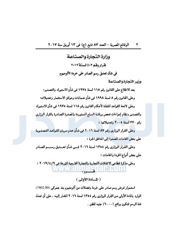 أخبار مصر "الوقائع" تنشر قرار "الصناعة" بتعديل رسوم الصادر على خردة الألومنيوم الإثنين 17 أبريل 2017 - 10:30 ص 4/17/2017 10:30:44 AM طارق قابيل، وزير التجارة والصناعة المصدر- خاص طباعة شارك نشرت الوقائع المصرية قرار المهندس طارق قابيل وزير الصناعة والتجارة رقم 503 لسنة 2017 بشأن تعديل رسوم الصادر على خردة الألومنيوم.لقراءة القرار: طباعة شارك وزير التجارة والصناعة وزارة التجارة الصناعية طارق قابيبل الوقائع المصرية الجريدة الرسمية تابع المصدر علي جوجل نيوز تطبيق نبض