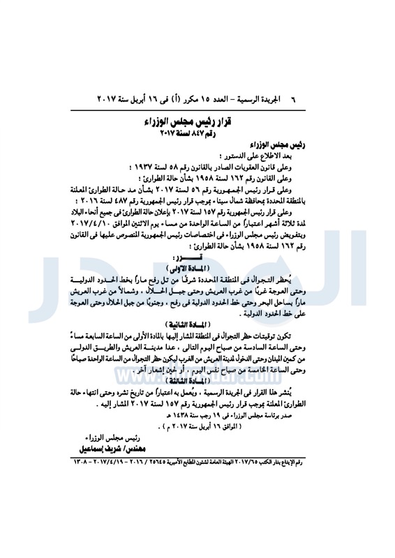 أخبار مصر الجريدة الرسمية تنشر قرار مجلس الوزراء حظر التجول في سيناء الأربعاء 19 أبريل 2017 - 12:13 م 4/19/2017 12:13:00 PM اجتماع مجلس الوزراء المصدر- خاص طباعة شارك نشرت الجريدة الرسمية، اليوم الأربعاء، بالعدد 15 مكرر، قرار مجلس الوزراء رقم 847 لسنة 2017 بفرض حظر التجوال في عدد من مناطق شمال سيناء.لقراءة القرار: طباعة شارك مجلس الوزراء شمال سيناء شريف اسماعيبل حظر التجوال حالة الطوارئ الجريدة الرسمية تابع المصدر علي جوجل نيوز تطبيق نبض