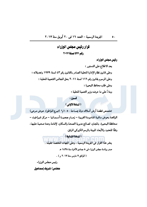 نشرت الجريدة الرسمية، اليوم الخميس، بالعدد 16، تسعة قرارات لرئيس مجلس الوزراء المهندس شريف إسماعيل، رقم 570،571،572،688،689،690،691،692،693 بتخصيص عدد من الأراضي، في عدد من المحافظات.