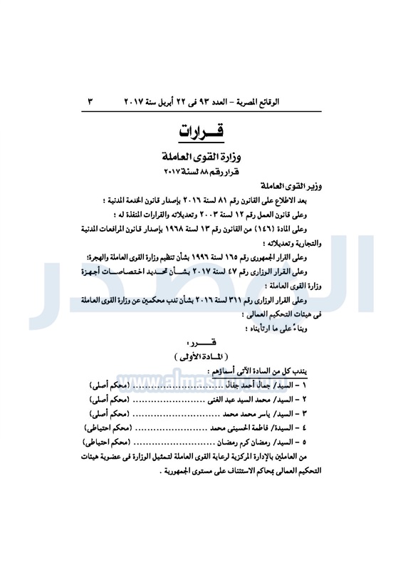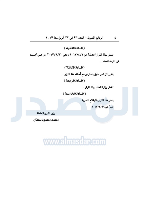 أخبار مصر القوى العاملة تنتدب محكمين لـ"التحكيم العمالي" السبت 22 أبريل 2017 - 11:12 ص 4/22/2017 11:12:59 AM وزير القوى العاملة محمد سعفان المصدر- خاص طباعة شارك نشرت الوقائع المصرية في عددها رقم 93 الصادر اليوم السبت، قرار وزارة القوى العاملة رقم 88 لسنة 2017 بشأن ندب محكمين عن الوزارة في هيئات التحكيم العمالي.لقرارءة القرار: طباعة شارك وزارة القوى العاملة هيئة التحكيم العمالي الوقائع المصرية الجريدة الرسمية تابع المصدر علي جوجل نيوز تطبيق نبض