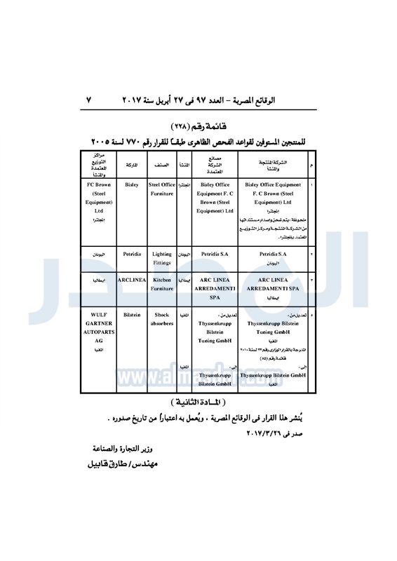 نشرت الوقائع المصرية في عددها الصادر اليوم رقم 97 قرار وزارة التجارة والصناعة رقم 455 لسنة 2017 بشأن قيد بعض المنتجين المستوفين لقواعد الاكتفاء بالفحص الظاهري للرسائل المستوردة من السلع الصناعية غير الغذائية.