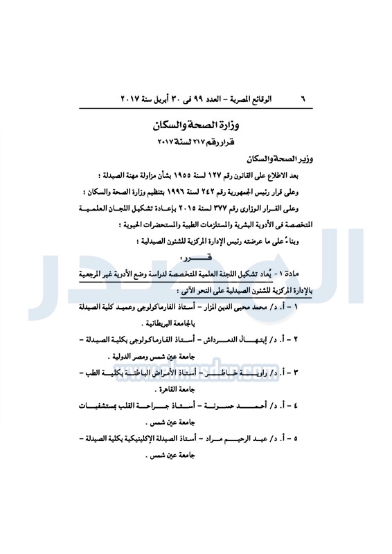 نشرت الوقائع المصرية اليوم في عددها الصادر رقم 99 قرار وزارة الصحة رقم 217 لسنة 2017 بشأن إعادة تشكيل اللجان العلمية المتخصصة في الأدوية البشرية والمستلزمات الطبية والمستحضرات الحيوية.