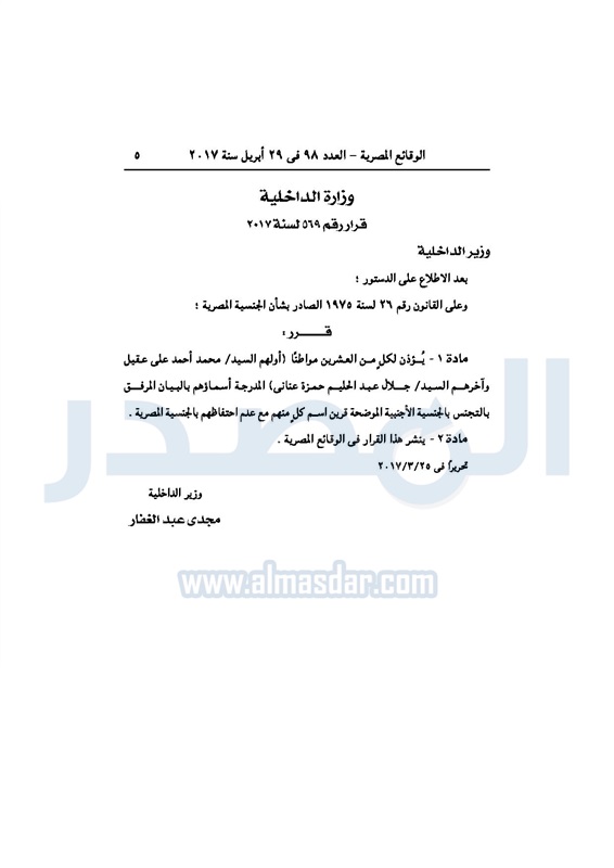 أخبار مصر "الداخلية" تسحب الجنسية من 20 مصريا الأحد 30 أبريل 2017 - 12:06 م 4/30/2017 12:06:35 PM وزير الداخلية - صورة أرشيفية المصدر- خاص طباعة شارك نشرت الوقائع المصرية في العدد رقم 98، الصادر في 29 أبريل 2017، قرار وزارة الداخلية رقم 569 لسنة 2017، بشأن الإذن لـ20 مواطنا بالتجنس بجنسية أجنبية مع عدم الاحتفاظ بجنسيتهم المصرية.لقراءة القرار: طباعة شارك وزارة الداخلية مجدي عبد الغفار وزير الداخلية الوقائع المصرية الجنسية الاجنبية الجريدة الرسمية تابع المصدر علي جوجل نيوز تطبيق نبض