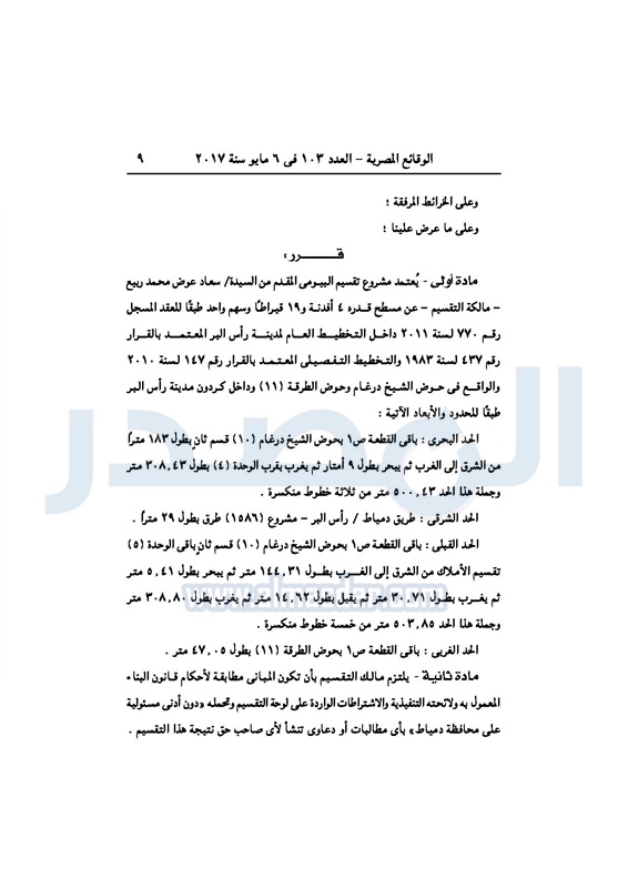 كما نشرت الجريدة قرار محافظة دمياط رقم 196 لسنة 2017 بشأن اعتماد مشروع تقسيم البيومي عن مسطح قدره 4 أفدنة و19 قيرات بالامتداد العمراني برأس البر.