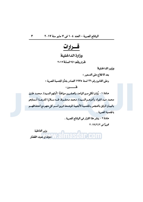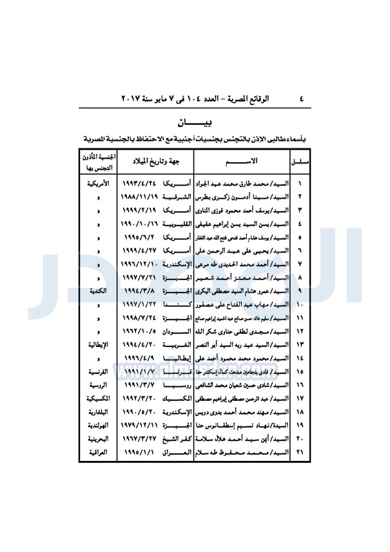 نشرت الجريدة الرسمية في عددها رقم 104 الصادر، اليوم الأحد، قرار وزارة الداخلية رقم 251 بشأن منح الجنسية الأجنبية لـ21 مواطنا مصريا مع احتفاظهم بالجنسية المصرية.
