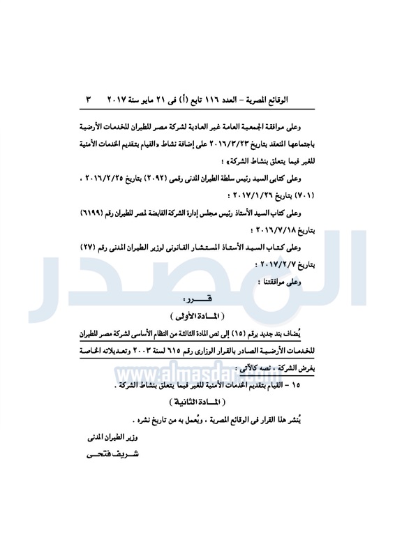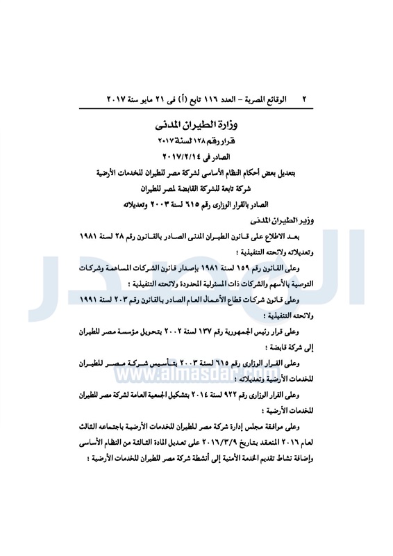 سياحة و طيران "الطيران المدني" تعدل بعض أحكام النظام الأساسي الإثنين 22 مايو 2017 - 12:08 م 5/22/2017 12:08:16 PM مصر للطيران - أرشيفية المصدر - خاص طباعة شارك نشرت الوقائع المصرية، اليوم الاثنين، قرار وزارة الطيران المدني رقم 128 لسنة 2017 بتعديل بعض أحكام النظام الأساسي لشركة مصر للطيران للخدمات الأرضية.لقراءة القرار: طباعة شارك مصر للطيران الوقائع المصرية الطيران المدني الجريدة الرسمية تابع المصدر علي جوجل نيوز تطبيق نبض