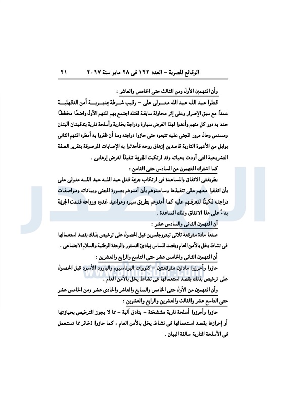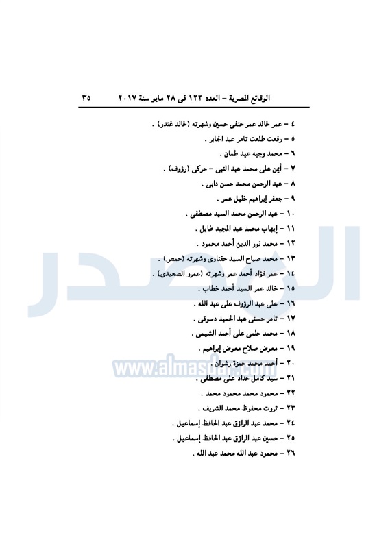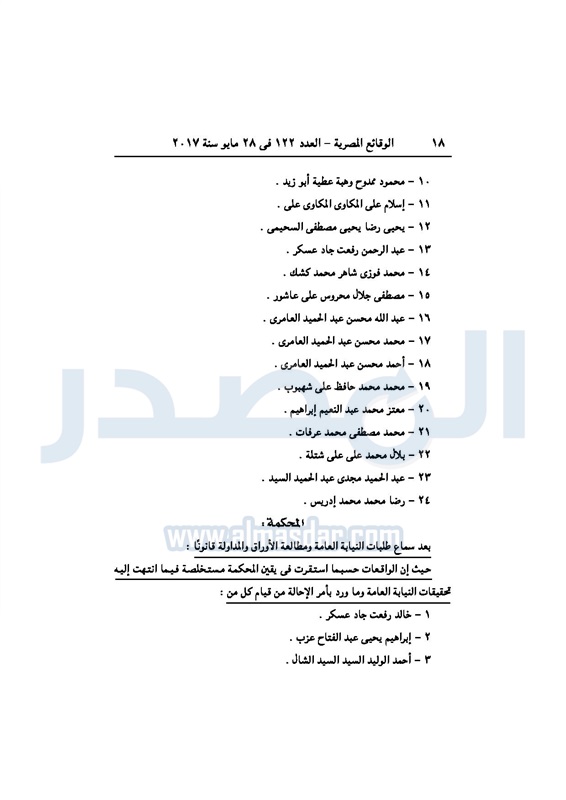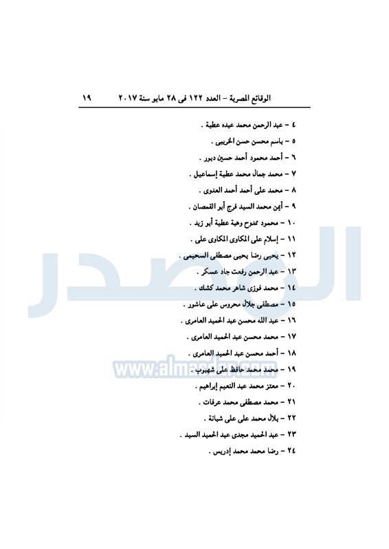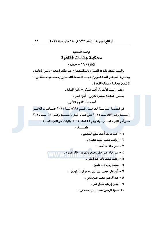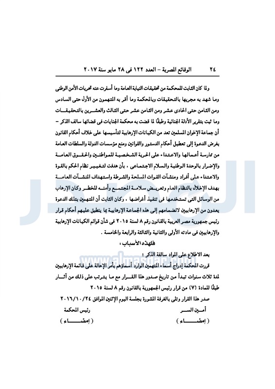 نشرت جريدة الوقائع الرسمية، في عددها رقم 122 الصادر في 28 مايو 2017، 3 أحكام صادرة عن محكمة جنايات القاهرة، بإدراج 98 مدانًا في قضايا إرهاب، على قوائم الإرهابيين لمدة 3 سنوات.