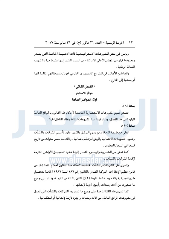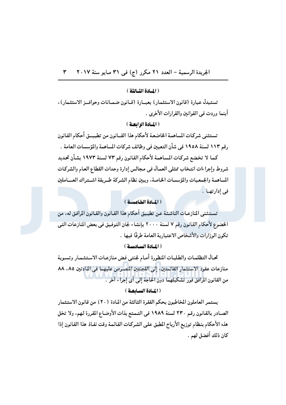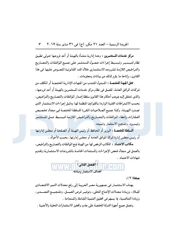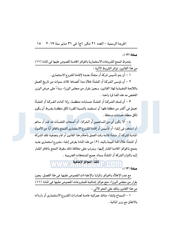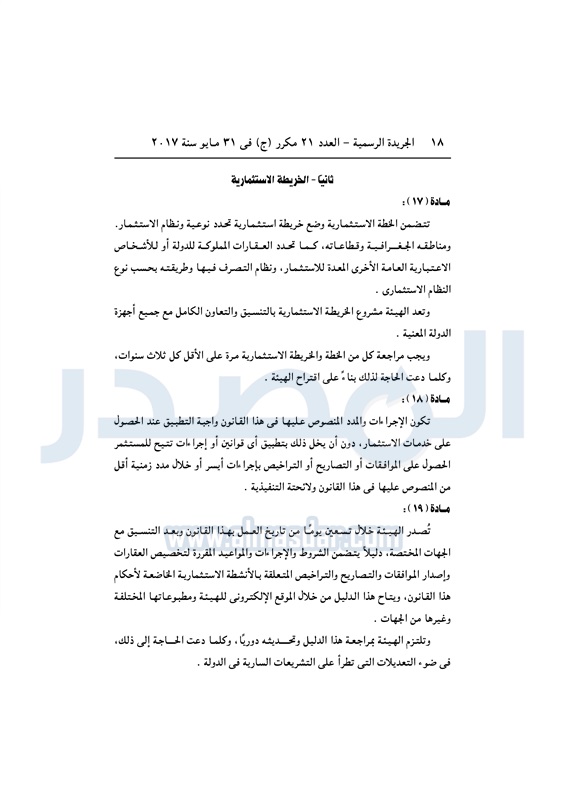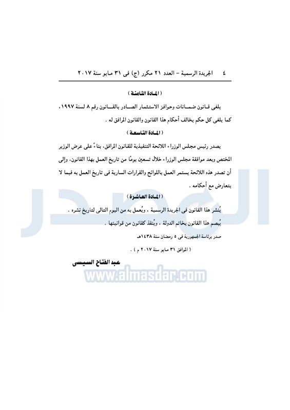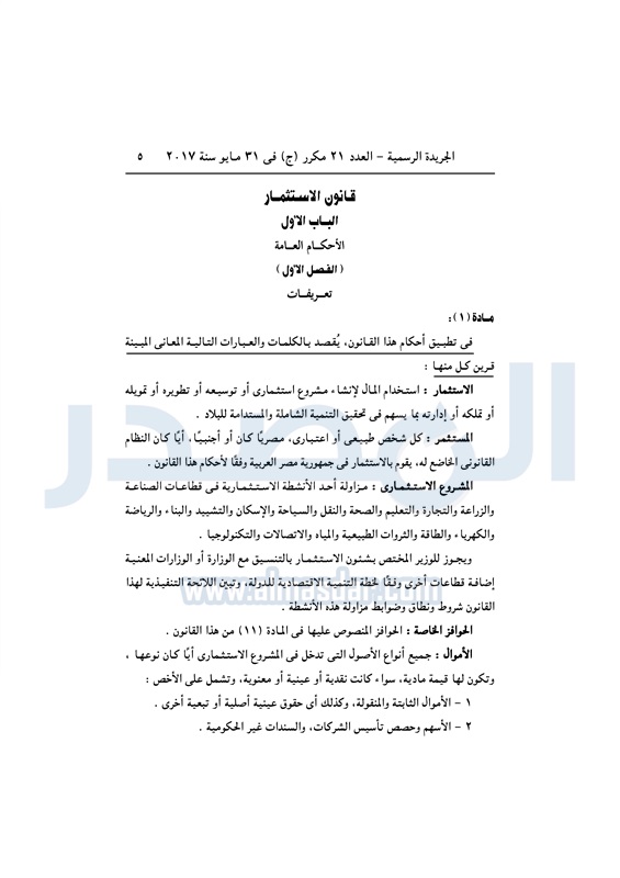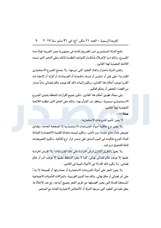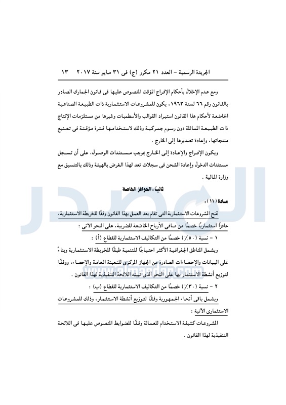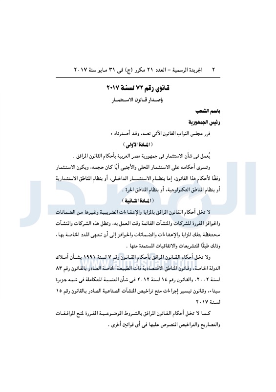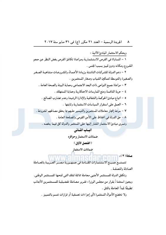 استثمار "المصدر" تنشر نص قانون الاستثمار الجديد الجمعة 02 يونيو 2017 - 06:00 م 6/2/2017 6:00:00 PM الهيئة العامة للاستثمار المصدر - خاص طباعة شارك نشرت الجريدة الرسمية، في العدد رقم 21 مكرر "ج"، الصادر في 31 مايو 2017، قرار الرئيس عبدالفتاح السيسي، باصدار قانون الاستثمار.لقراءة نص القانون: طباعة شارك قانون الاستثمار السيسى الجريدة الرسمية تابع المصدر علي جوجل نيوز تطبيق نبض
