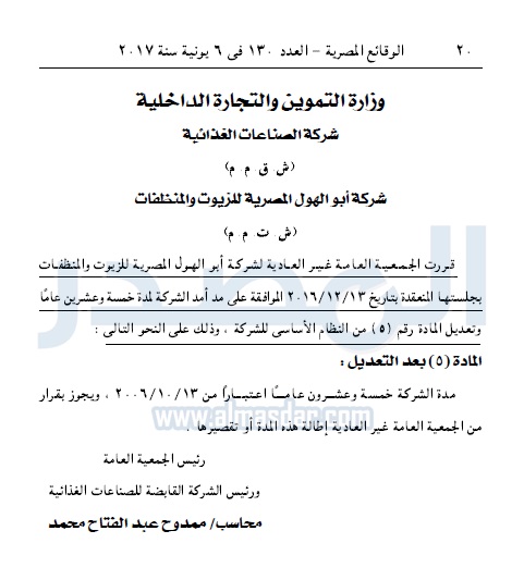 أسواق "أبو الهول" للزيوت والمنظفات تمد الشركة 25 عاما الثلاثاء 06 يونيو 2017 - 12:41 م 6/6/2017 12:41:06 PM وزارة التموين المصدر - خاص طباعة شارك نشرت جريدة الوقائع المصرية قرار الجمعية العامة غير العادية لشركة أبو الهول المصرية للزيوت والمنظفات بمد أمد الشركة لمدة خمسة وعشرين عامًا.لقراءة القرار: طباعة شارك وزارة التموين شركة ابوالهول الوقائع المصرية الزيوت والمنظفات تابع المصدر علي جوجل نيوز تطبيق نبض
