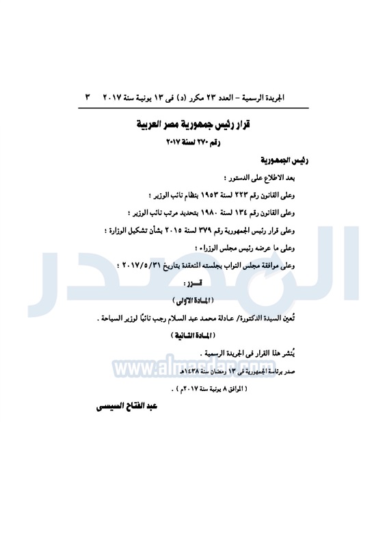 أخبار مصر تعيين عادلة عبد السلام نائبا لوزير السياحة الأربعاء 14 يونيو 2017 - 03:41 م 6/14/2017 3:41:43 PM عادلة محمد عبد السلام نائبا لوزير السياحة المصدر- خاص طباعة شارك نشرت الجريدة الرسمية في عدده الصادر، اليوم الأربعاء، قرار رئيس الجمهورية رقم 270 بشأن تعيين السيدة عادلة محمد عبد السلام نائبا لوزير السياحة. لقراءة القرار: طباعة شارك عادلة محمد عبد السلام الوقائع المصرية السيد يحيى راشد وزير السياحة الجريدة الرسمية تابع المصدر علي جوجل نيوز تطبيق نبض