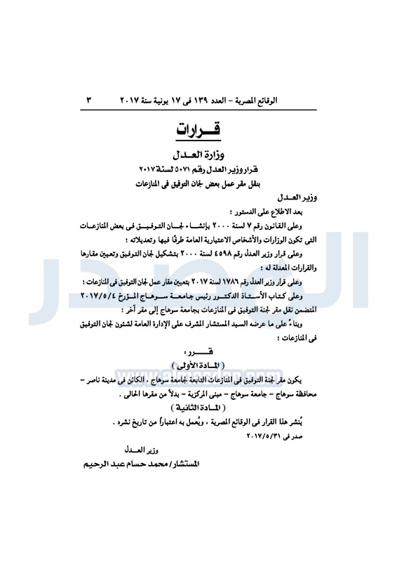 أخبار مصر العدل: نقل مقر عمل بعض لجان التوفيق في المنازعات السبت 17 يونيو 2017 - 01:56 م 6/17/2017 1:56:58 PM وزير العدل في مؤتمر صحفي المصدر - خاص طباعة شارك نشرت الوقائع المصرية في عددها رقم 139، الصادر في 17 يونيو 2017، قرار وزير العدل رقم 5071 لسنة 2017، بنقل مقر عمل بعض لجان التوفيق في المنازعات.لقراءة القرار: طباعة شارك وزير العدل لجنة فض المنازعات لجان التوفيق الوقائع المصرية الجريدة الرسمية تابع المصدر علي جوجل نيوز تطبيق نبض