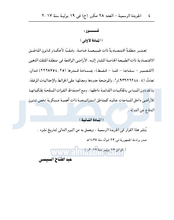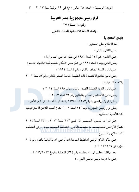 أخبار مصر قرار جمهوري بإنشاء المنطقة الاقتصادية للمثلث الذهبي الثلاثاء 25 يوليو 2017 - 12:43 م 7/25/2017 12:43:00 PM قرار جمهوري المصدر - خاص طباعة شارك نشرت الجريدة الرسمية، في العدد 28 مكرر، قرار رئيس الجمهورية الرئيس عبد الفتاح السيسي، رقم 341 لسنة 2017 بإنشاء المنطقة الاقتصادية للمثلث الذهبي. لقراءة القرار: طباعة شارك قرار جمهورى السيسى أخبار مصر تابع المصدر علي جوجل نيوز تطبيق نبض