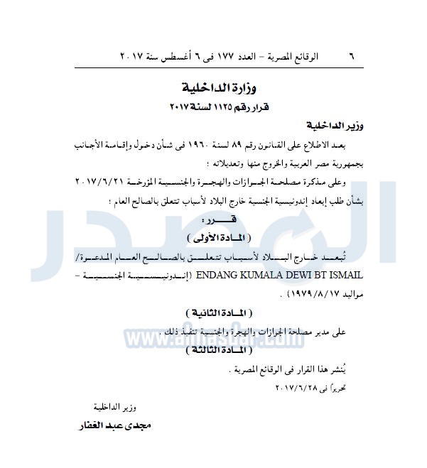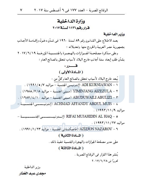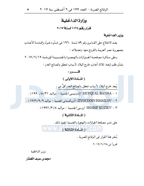 أخبار مصر بالأسماء.. "الداخلية" تستبعد 10 أجانب خارج مصر لأسباب تتعلق بالصالح العام الأحد 06 أغسطس 2017 - 03:35 م 8/6/2017 3:35:00 PM وزير الداخلية - صورة أرشيفية المصدر - خاص طباعة شارك نشرت الوقائع المصرية في العدد 177 قرار وزارة الداخلية رقم 1124 لسنة 2017 بشأن بإبعاد 10 أجانب خارج البلاد، لأسباب تتعلق بالصالح العام.لقراءة القرار: طباعة شارك وزير الداخلية جنسيات أجنبية الصالح العام الاجانب أخبار مصر تابع المصدر علي جوجل نيوز تطبيق نبض