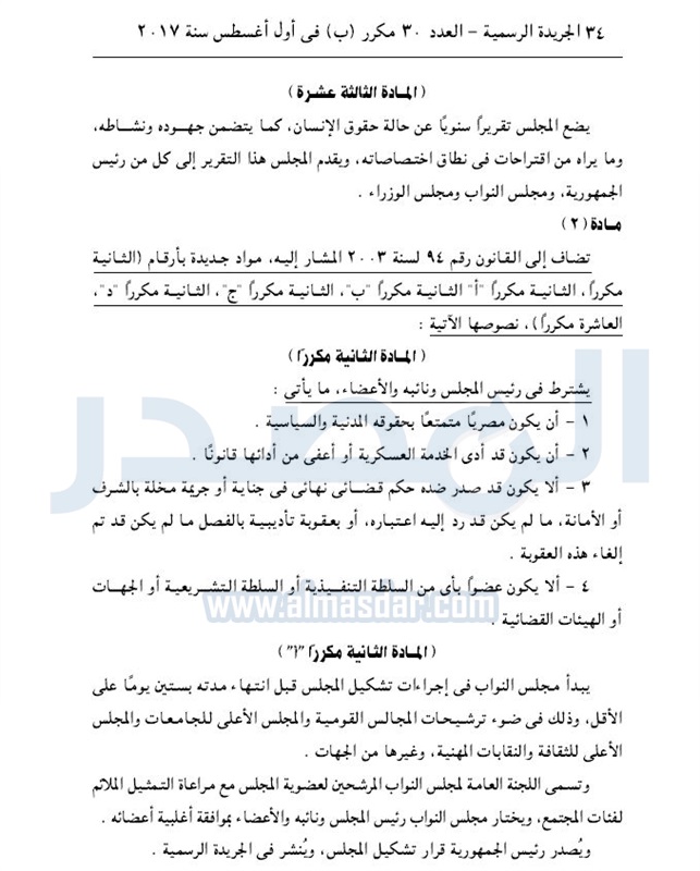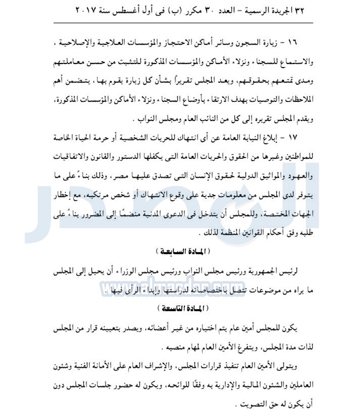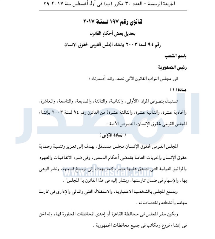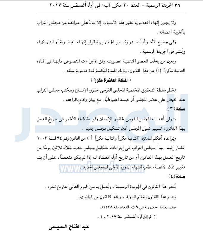 أخبار مصر السيسي يعدل بعض أحكام قانون إنشاء "القومي لحقوق الإنسان" (نص القرار) الإثنين 07 أغسطس 2017 - 12:45 م 8/7/2017 12:45:00 PM الرئيس عبد الفتاح السيسي المصدر - خاص طباعة شارك أصدر الرئيس عبد الفتاح السيسي، اليوم الاثنين، القانون رقم 197 لسنة 2017، بتعديل بعض أحكام القانون رقم 94 لسنة 2003 بإنشاء المجلس القومي لحقوق الإنسان.لقراء القرار: طباعة شارك مجلس النواب حقوق الانسان السيسى الجريدة الرسمية أخبار مصر تابع المصدر علي جوجل نيوز تطبيق نبض