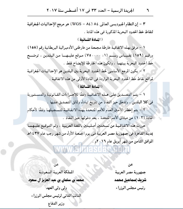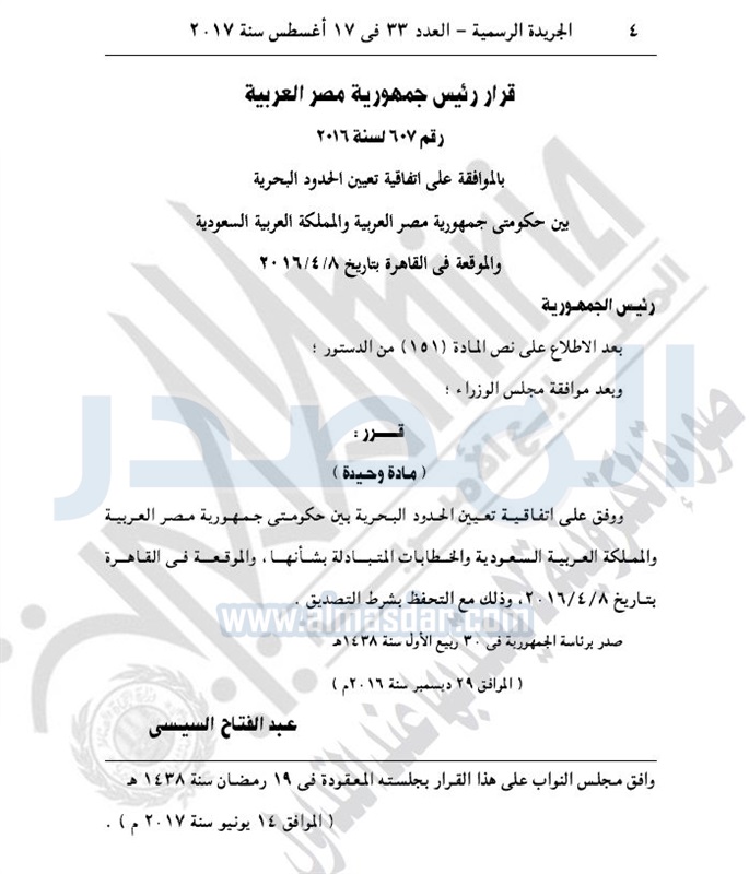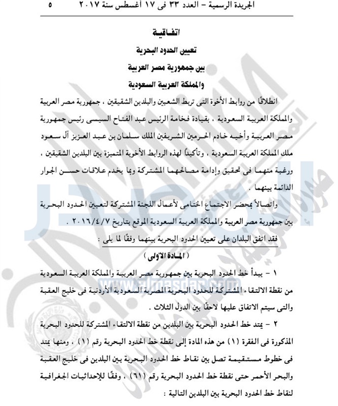 أخبار مصر الجريدة الرسمية تنشر نص اتفاقية تعيين الحدود بين مصر والسعودية الخميس 17 أغسطس 2017 - 10:18 ص 8/17/2017 10:18:00 AM السيسي المصدر - خاص طباعة شارك نشرت الجريدة الرسمية في عددها رقم 33 اليوم الخميس، قرار رئيس الجمهورية رقم 607 لسنة 2016، بالموافقة على اتفاقية تعيين الحدود البحرية بين حكومتي جمهورية مصر العربية والمملكة العربية السعودية والموقعة في القاهرة بتاريخ 8 أبريل 2016. لقراءة القرار: طباعة شارك مصر تيران وصنافير تعيين الحدود السعودية تابع المصدر علي جوجل نيوز تطبيق نبض
