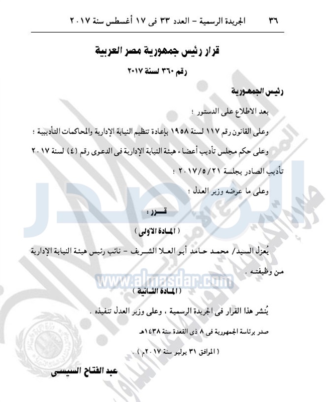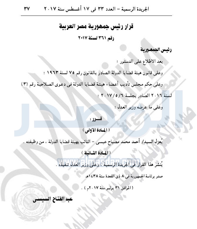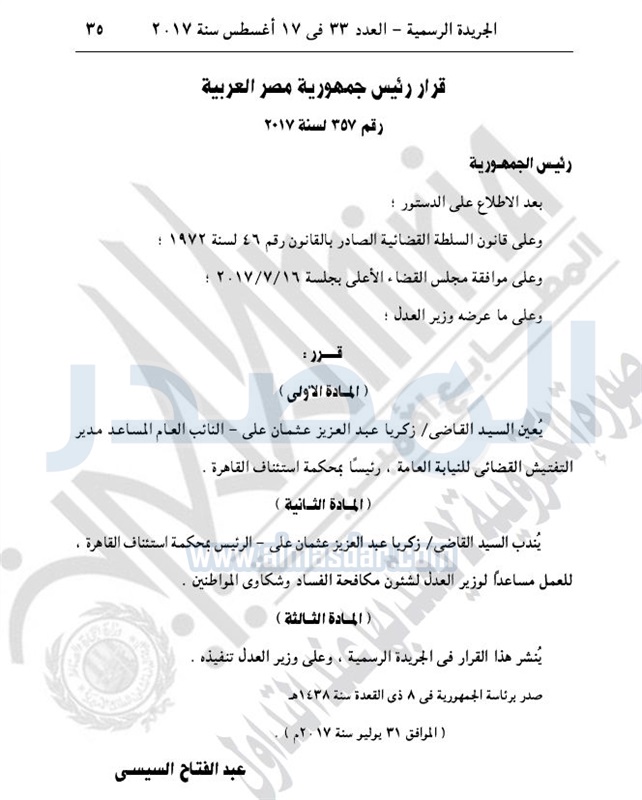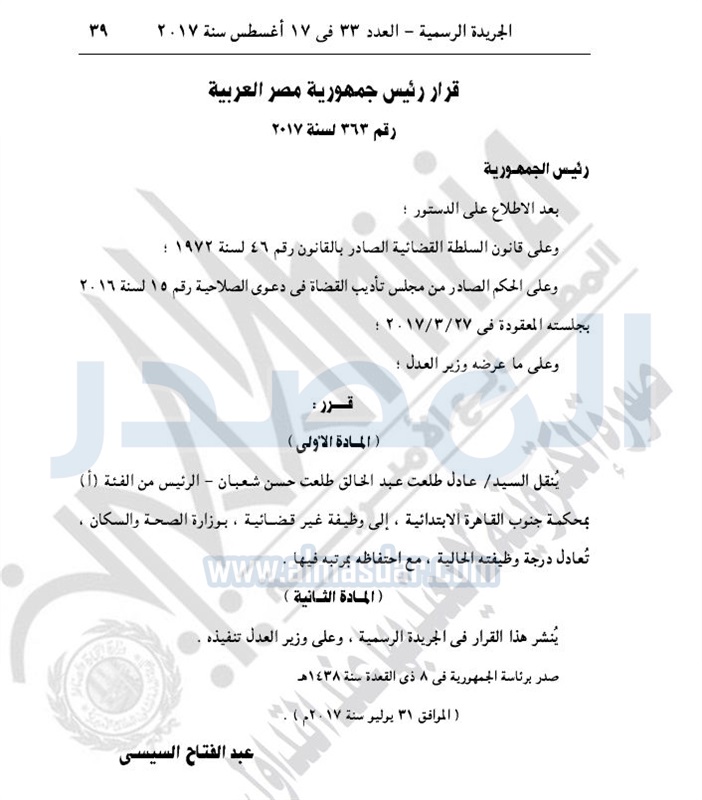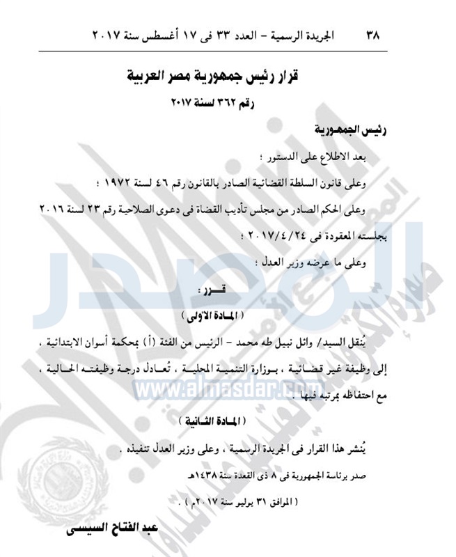 أخبار مصر بقرار من السيسي.. نقل وعزل بعض القضاة الخميس 17 أغسطس 2017 - 10:49 ص 8/17/2017 10:49:00 AM الرئيس عبد الفتاح السيسي المصدر - خاص طباعة شارك نشرت الجريدة الرسمية في عددها رقم 33، اليوم الخميس، عددا من القرارات الجمهورية، بشأن تعيين وعزل بعض القضاة.لقراءة القرارات: طباعة شارك قرارات جمهورية القضاه السيسى الجريدة الرسمية أخبار مصر تابع المصدر علي جوجل نيوز تطبيق نبض