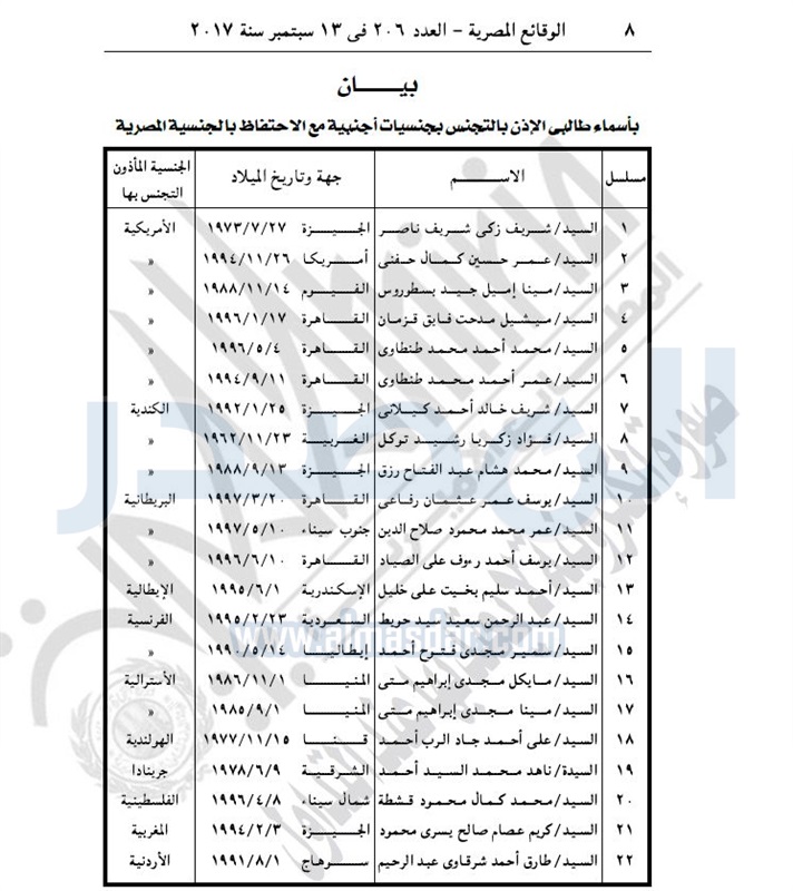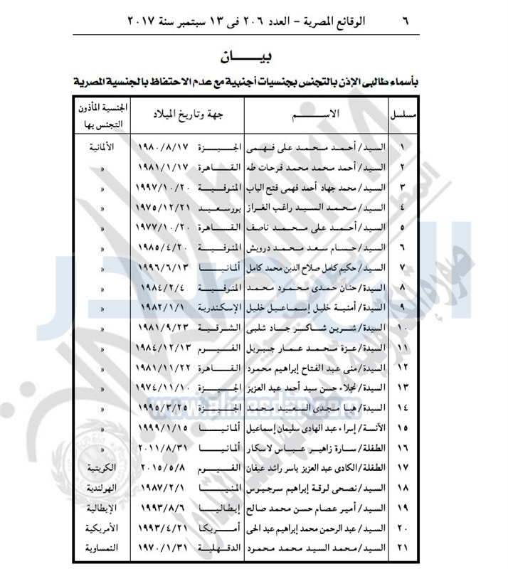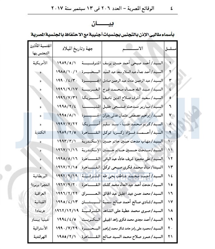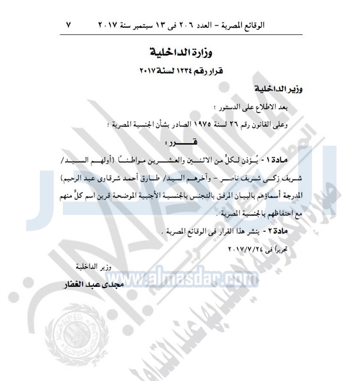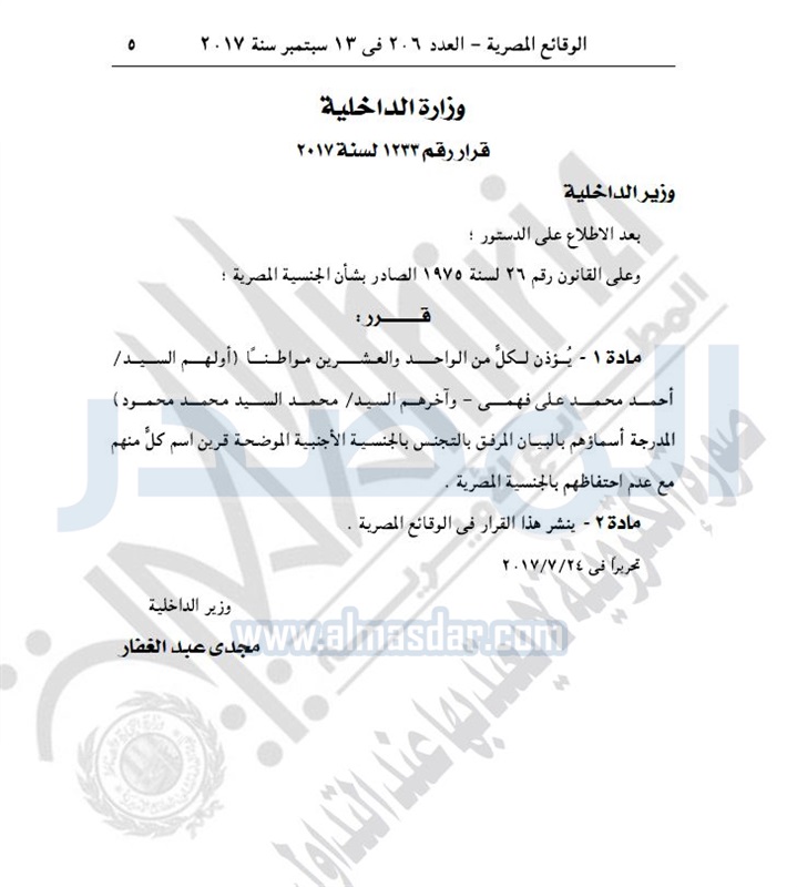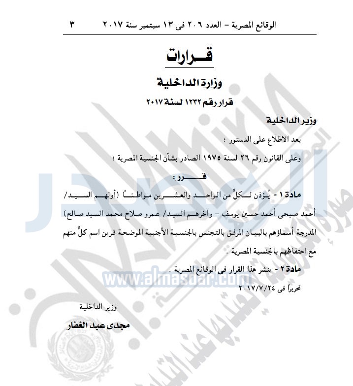 أخبار مصر بالأسماء.. "الداخلية" توافق على إعطاء 64 مواطنا الجنسية الأجنبية الأربعاء 13 سبتمبر 2017 - 10:39 ص 9/13/2017 10:39:00 AM وزير الداخلية - صورة أرشيفية المصدر - خاص طباعة شارك نشرت الوقائع المصرية، في عددها رقم 206 الصادر، اليوم الأربعاء، قرار وزارة الداخلية الخاصة بالموافقة على حصول 64 مواطنا على جنسيات أجنبية. لقراءة القرار: طباعة شارك الداخلية الجنسية المصرية الجنسية الاجنبية أخبار مصر تابع المصدر علي جوجل نيوز تطبيق نبض