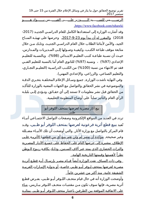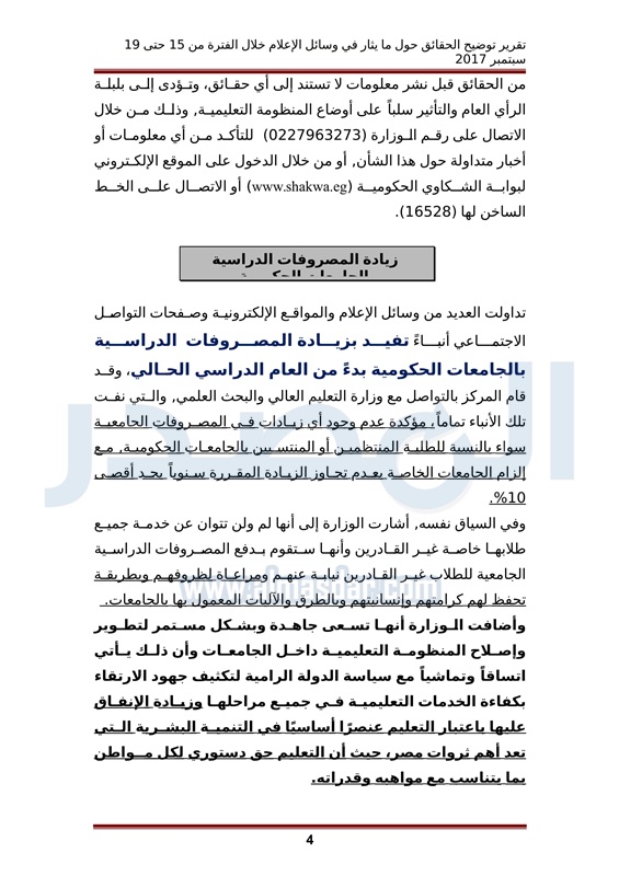 وأوضح التقرير حقائق العديد من القضايا المنشورة بوسائل الإعلام المختلفة سواء المواقع الإلكتروني أو الصحف أو الفضائيات، وتضمنت اتجاه الحكومة لخصخصة مرفق السكك الحديدية، رفع أسعار تذاكر المترو الأنفاق عقب تطبيق نظام التذاكر الملونة، ورود جملة "القدس عاصمة لإسرائيل" في كتاب الصف الثالث الإعدادي، زيادة المصروفات الدراسية بالجامعات الحكومية، إلغاء إجازة يوم السبت الدراسي، بيع آثار مصرية لعرضها بمتحف اللوفر أبو ظبي، تحويل العملات الورقية إلى أخرى معدنية.