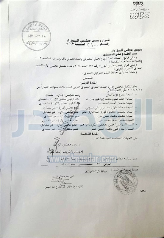 أصدر مجلس الوزراء قرارًا رقم 2100 لسنة 2017، اليوم الخميس، بإعادة تشكيل مجلس إدارة البنك العقاري المصري العربي، لمدة ثلاث سنوات اعتبارًا من 25 سبتمبر 2017.